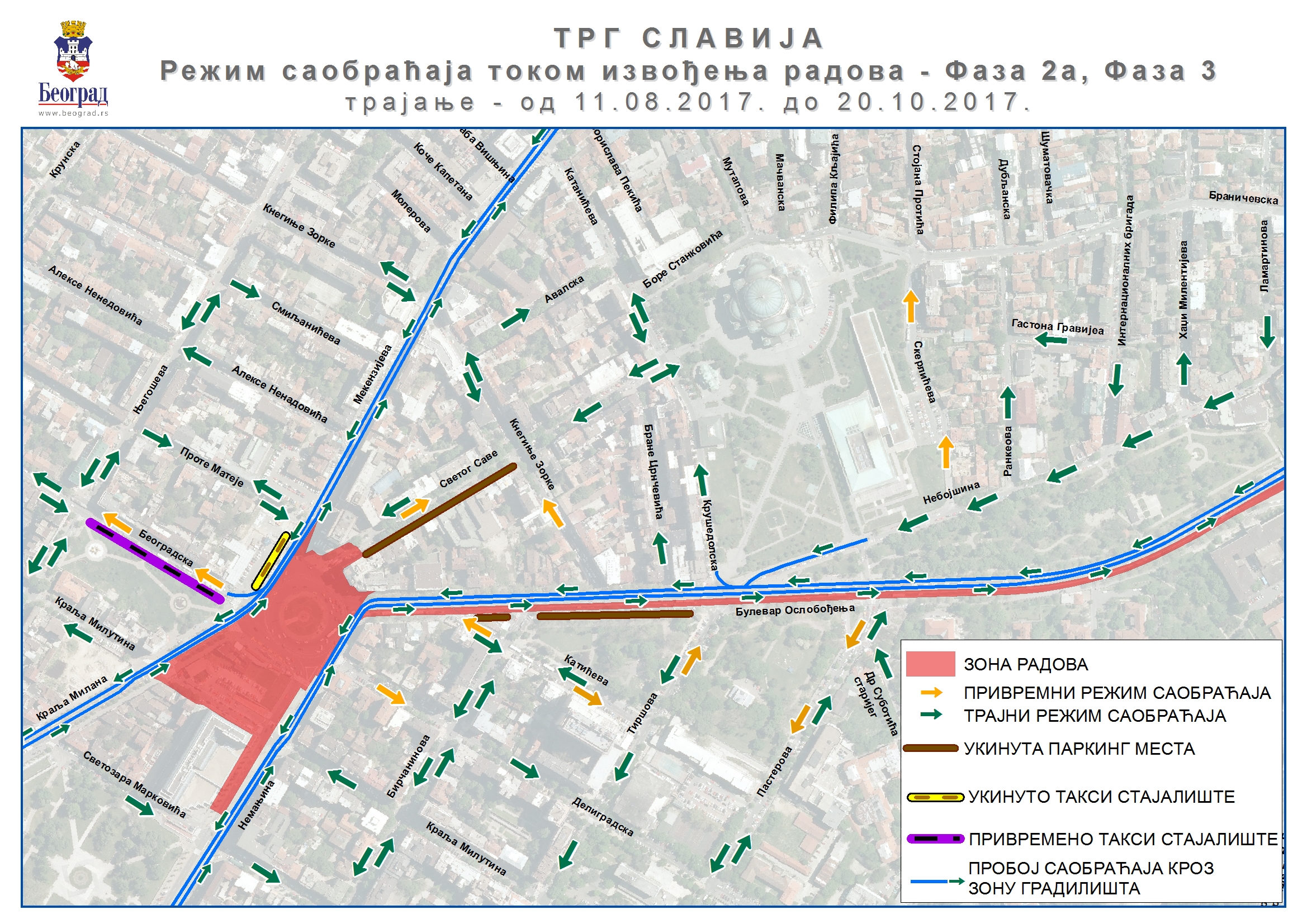 Током радова које изводи МБА „Ратко Митровић – Нискоградња“ д.о.о. биће на снази посебна организација саобраћаја на Тргу Славија и у Булевару ослобођења, од Трга Славија до Бокељске, у периоду од 11.08.2017. до 20.10.2017. године.