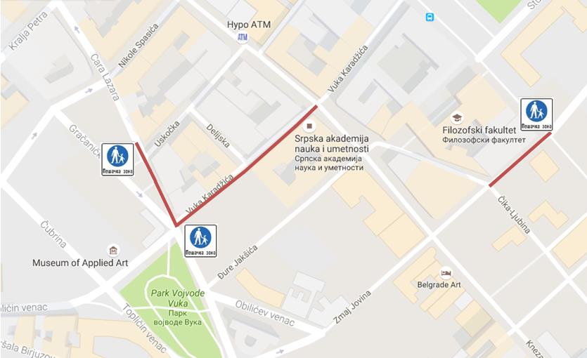 Градска управа града Београда, Секретаријат за саобраћај, је ове године обележила три пешачке зоне које ће бити промовисане у оквиру Евроске недеље мобилности 2016, а у циљу унапређења пешачког саобраћаја.