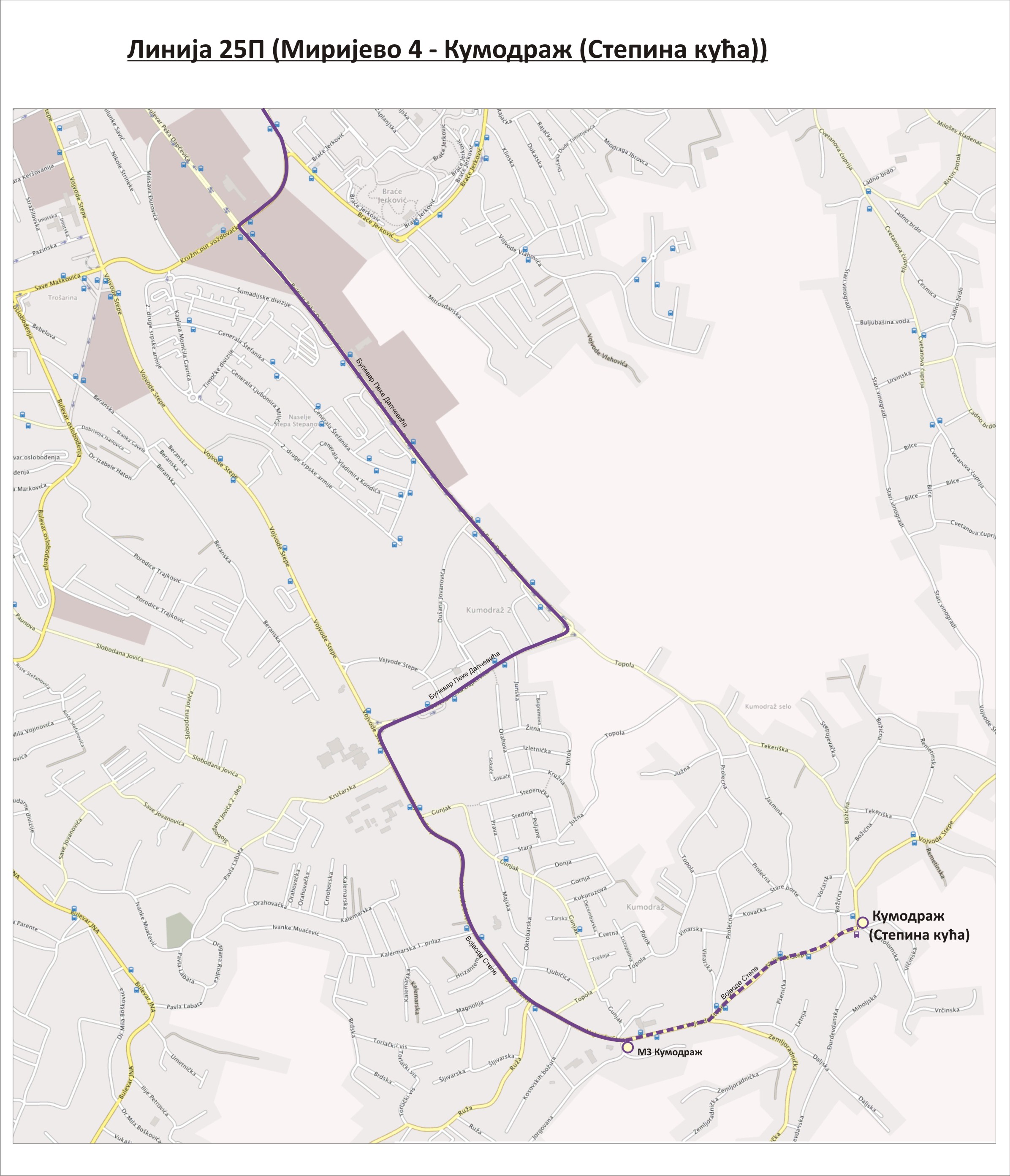 Од уторка 23.02.2016. године биће извршена трајна режимска измена и продужена трасa линије јавног превоза бр. 25П од постојећег терминуса „МЗ Кумодраж“ до новоуспостављеног „Кумодража /Степина кућа/“.