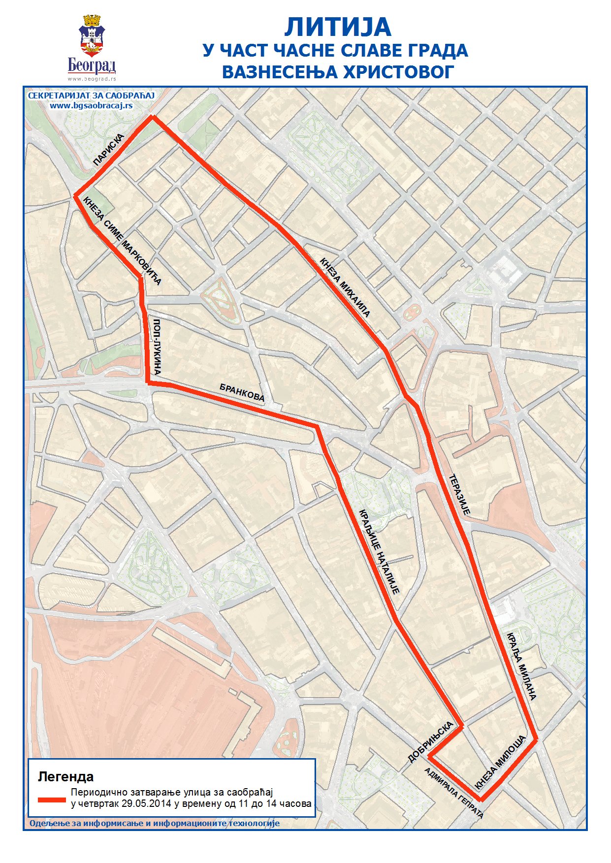 Током Литије, која се одржава у част Крсне славе Града, Вазнесења Христовог, у четвртак, 29.05.2014. године на снази ће бити посебна организација саобраћаја:- Траса Литије је следећа: ул. Адмирала Гепрата (почетак литије испред Цркве Светог Вазнесења), ул. Кнеза Милоша (од ул. Адмирала Гепрата до ул. Краља Милана), ул. Краља Милана, ул. Теразије (заустављање 5 - 10 минута испред хотела Москва), ул. Кнеза Михаила, ул. Париска (заустављање испред Саборне цркве), ул. Кнеза Симе Марковића, ул. Поп Лукина, ул. Бранкова, ул. Краљице Наталије (од Зеленог венца до Добрињске) Опширније