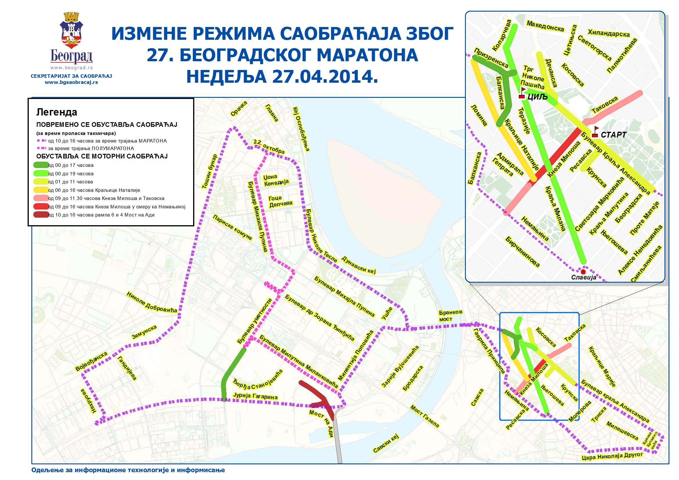 Секретаријат за саобраћај је поводом одржавања 27. Београдског маратона, дана 27.04.2014. године издао сагласност да се:• од 00:00 до 19:00 27.04.2014. године, забрани моторни саобраћај и уклоне сва возила која нису у функцији одржавања маратона у улицама: Коларчевој, Теразије и Краља Милана као и део Трга Николе Пашића према Теразијама;