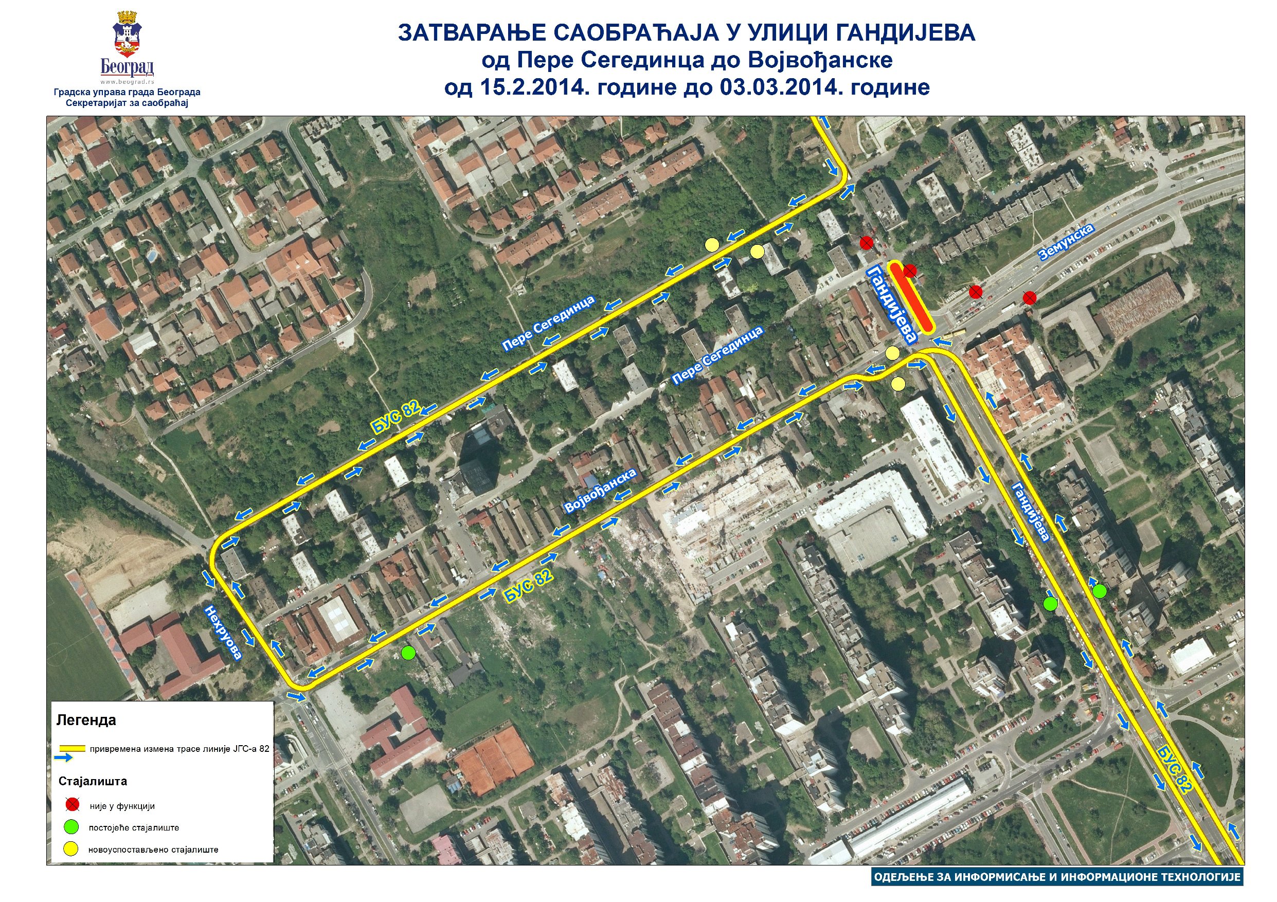 У Гандијевој улици на делу од улице Пере Сегединца до Војвођанске улице, у периоду од 15.02. - 03.03.2014. године, током изградње новог коловоза саобраћај ће бити потпуно обустављен. Током поменутих радова улица Пере Сегединца на делу од Гандијеве до Нехруове улице за саобраћај ће бити двосмерна.За време извођења радова возила са линијe ЈГП-а број 82 ће делимично изменити трасу и уместо Гандијевом улицом: Опширније