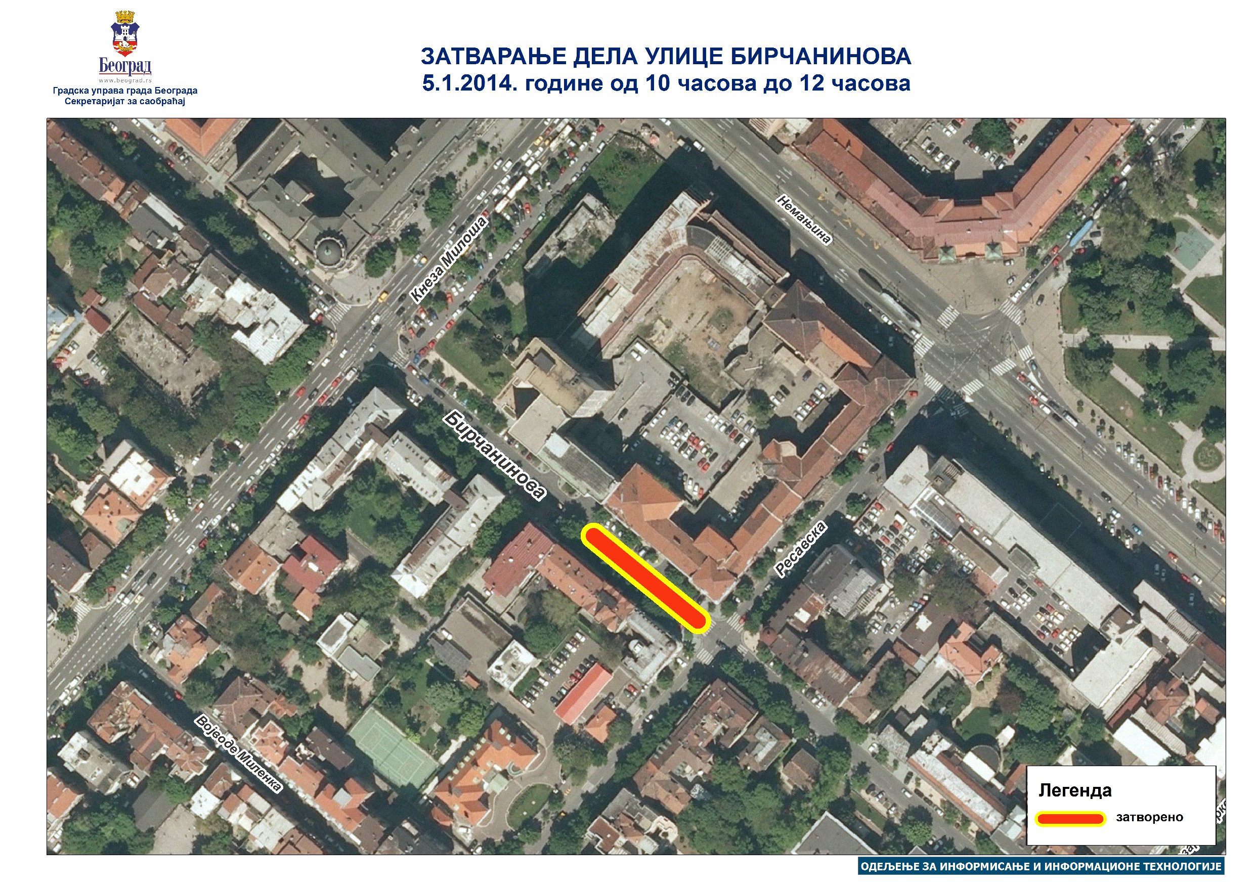 Због радова и демонтирања грађевинског крана у Бирчаниновој улици, 5. јануара 2014. године, у периоду од 10:00 до 12:00 часова, за саобраћај ће бити затворен део Бирчанинове улице од Министарства одбране, до Ресавске улице.