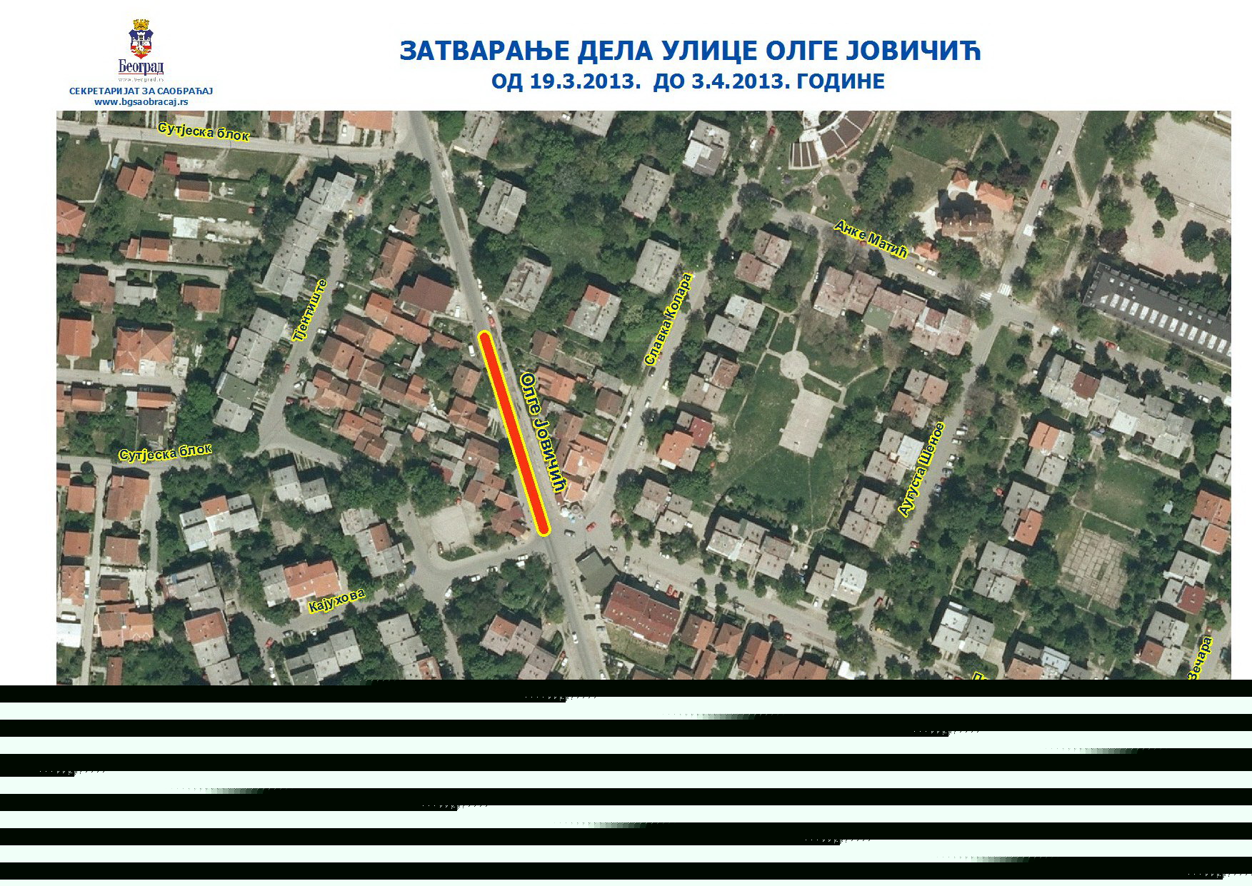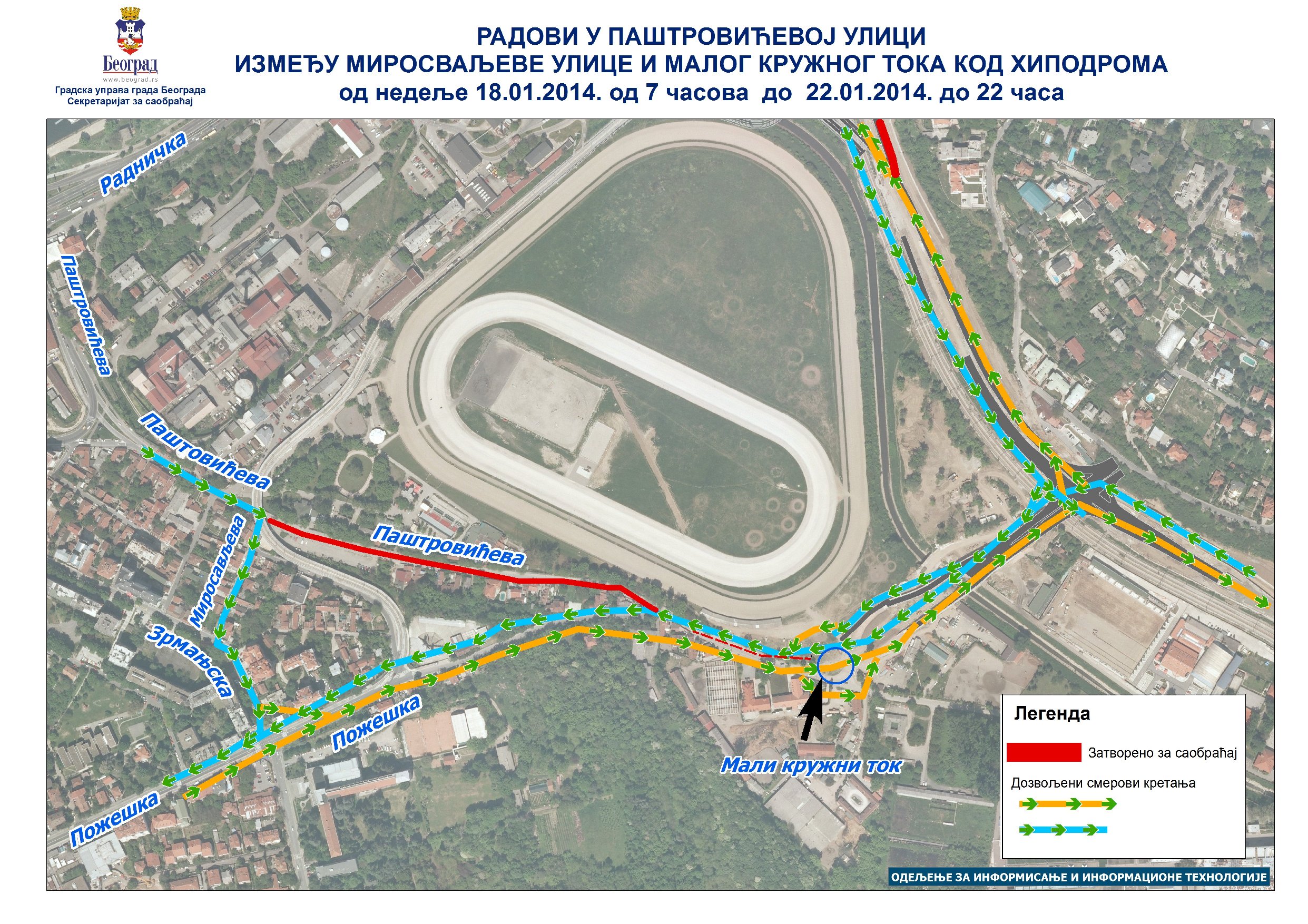 Због извођења радова на уклапању у нову саобраћајницу у периоду од 18.01.2014 у 7.00 до 22.01.2014 у 22.00 часа за саобраћај ће бити затворен део Паштровићеве улице од Миросављеве улице до