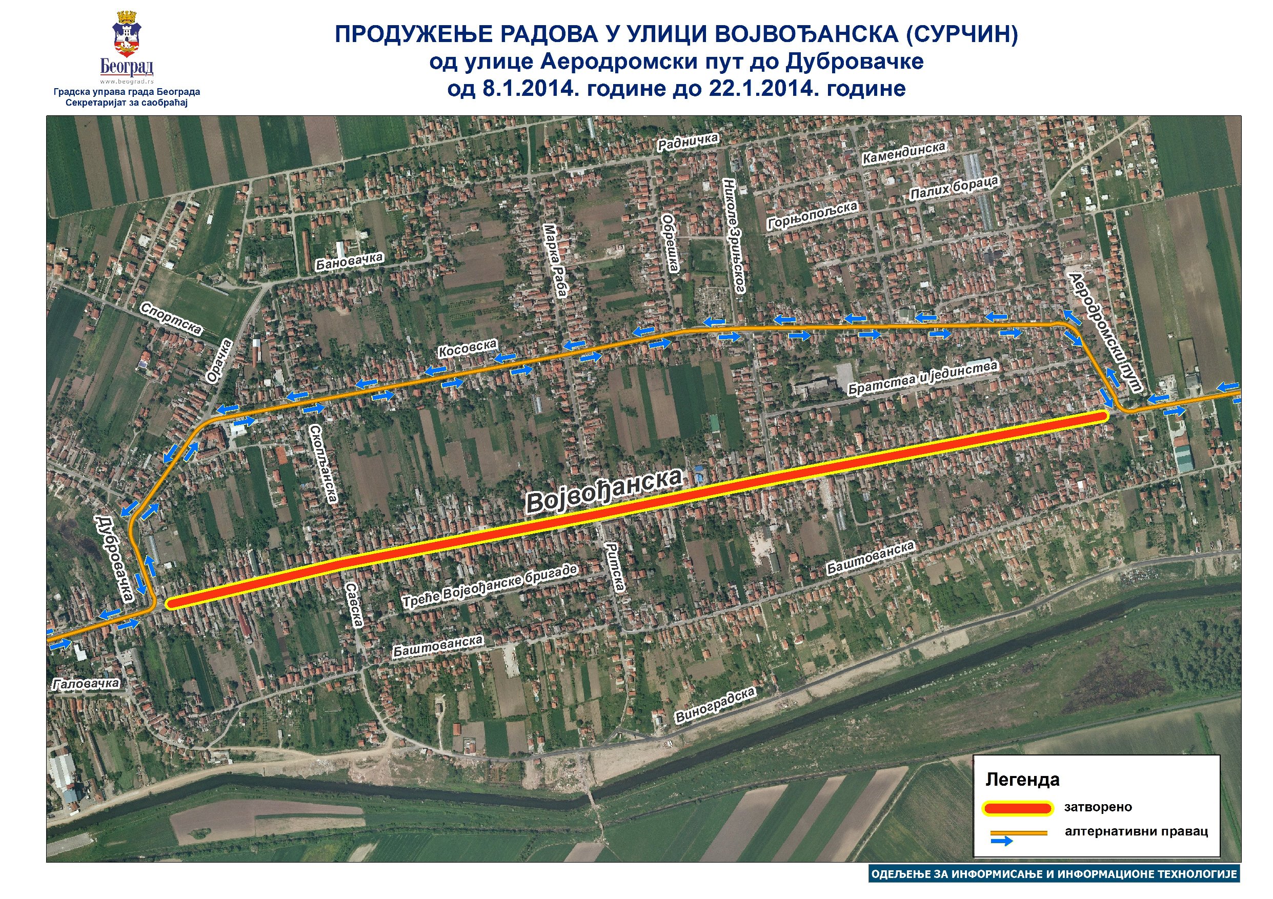 Током продужења радова на поправци и асфалтирању коловоза, које изводи ЈКП „Београд пут“ у периоду од 08.01.2014. године до 22.01.2014. године, Војвођанска улица, на делу од улице Аеродромски пут до Дубровачке улице (Сурчин), ће бити затворена за саобраћај.Током извођења поменутих радова возила ЈГС-а са линија бр. 601, 603, 604, 605 и 610 ће саобраћати према следећем режиму: