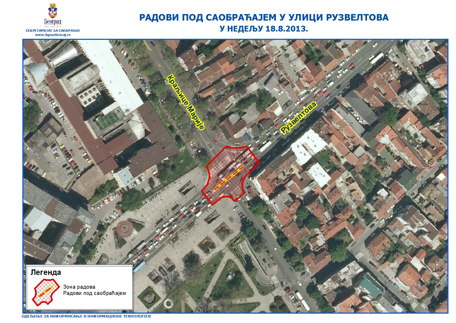 У недељу, 18. августа 2013. године, ГСП „Београд“ изводи радове на поправци напојног кабла за трамвајску контактну мрежу, на коловозу у Улици Рузвелтова.