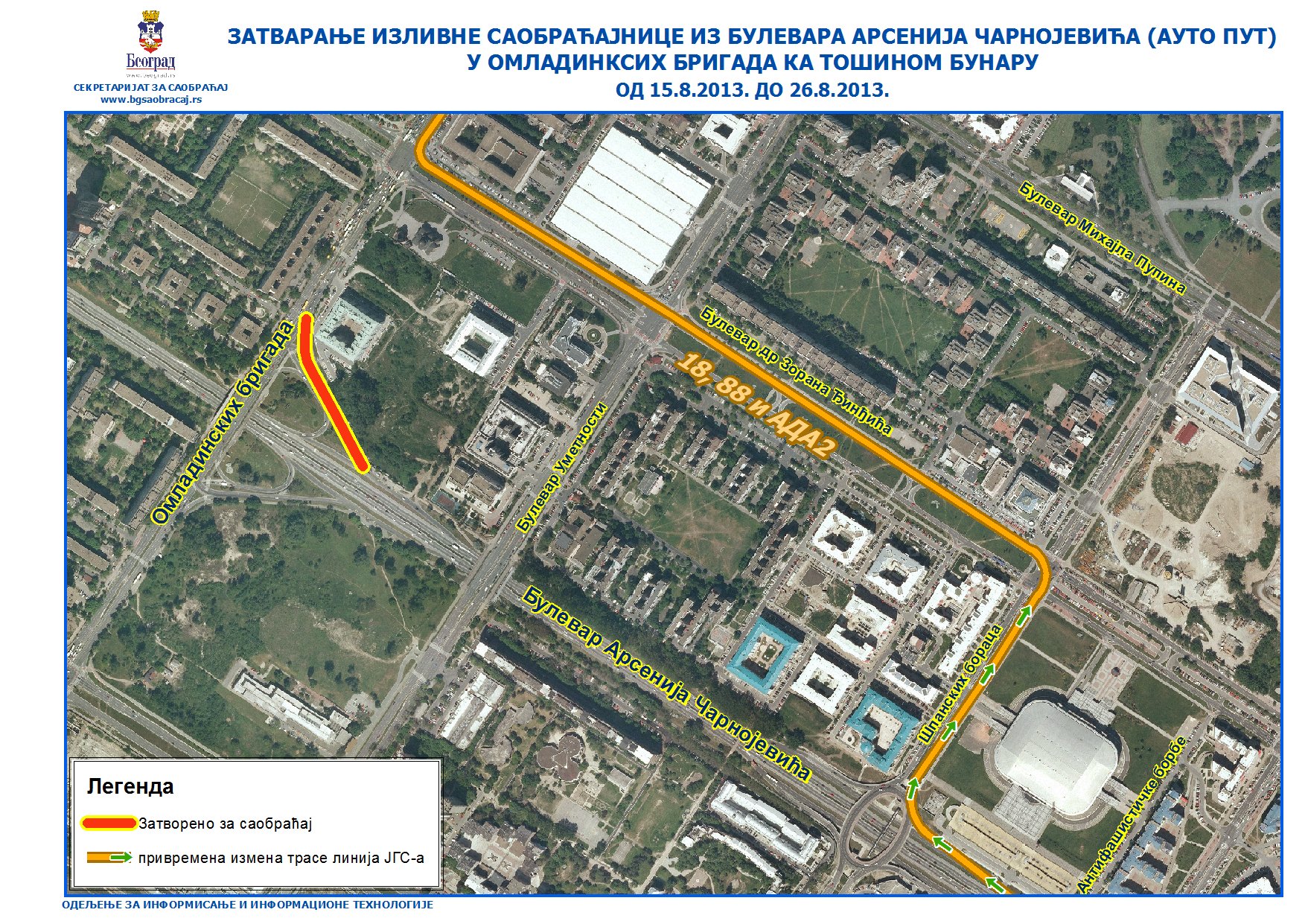 Tоком извођења радова на поправци и асфалтирању коловоза на рампи за искључење са аутопута Београд-Шид (смер из правца Ниша) у Улицу Омладинских бригада у Београду, које изводи ЈКП „Београд пут“ у периоду од 15.08.2013. године до 26.08.2013.године, возила са линија ЈГП-а ће делимично изменити трасу и то: