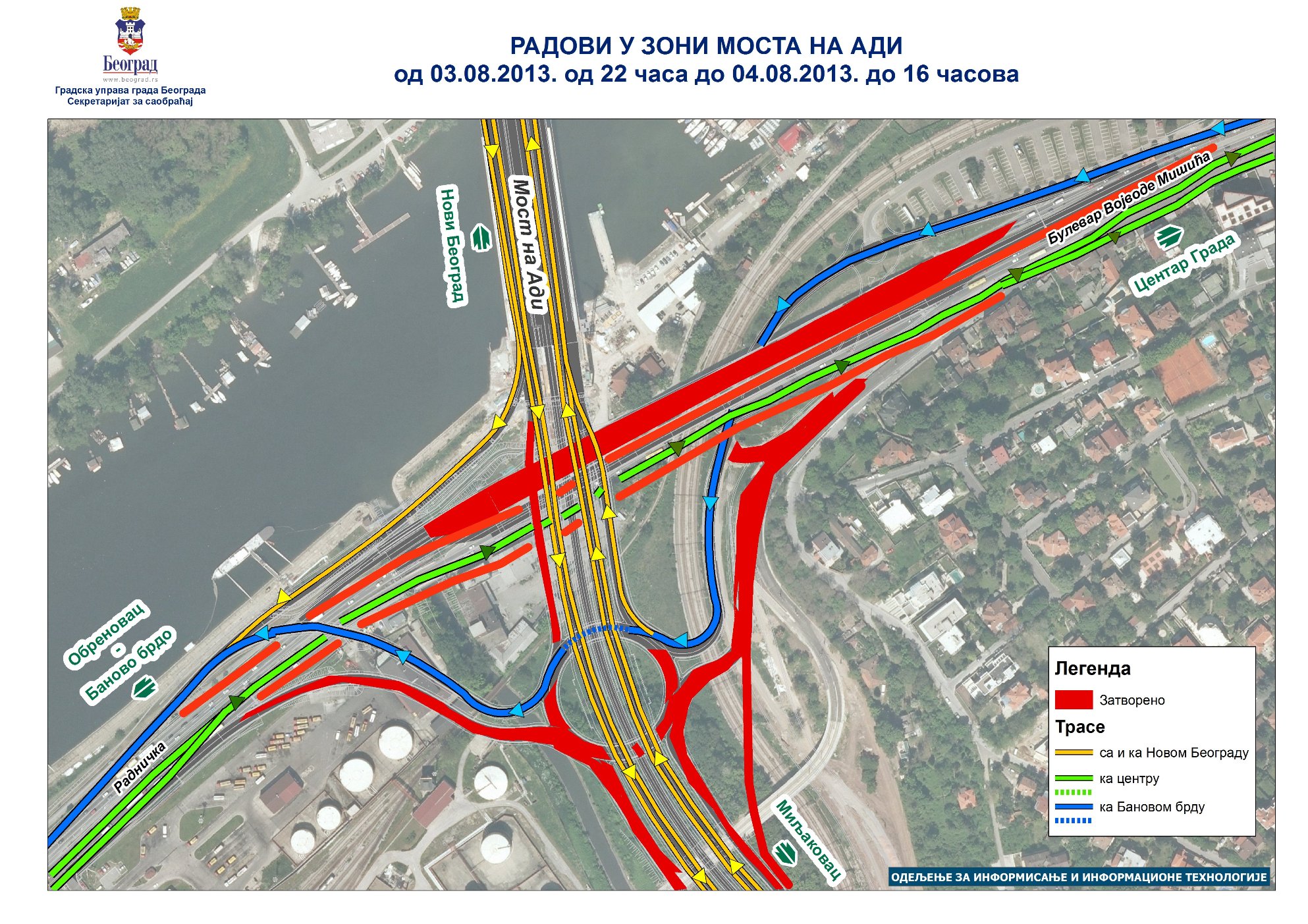 Због извођења радова на постављању носача трећег сегмента моста преко Топчидерске реке од суботе 03.08.2013. од 22 часа до недеље 04.08.2013. до 16 часова поред важећих измена доћи ће до додатних измена режима саобраћаја у оквиру којих ће се за сваки смер кретања бити обезбеђена по једна саобраћајна трака на следећи начин:ЈП „Путеви Србије“, као инвеститор радова, обавештава да ће се почев од 05.08.2013.г. обављати радови на: