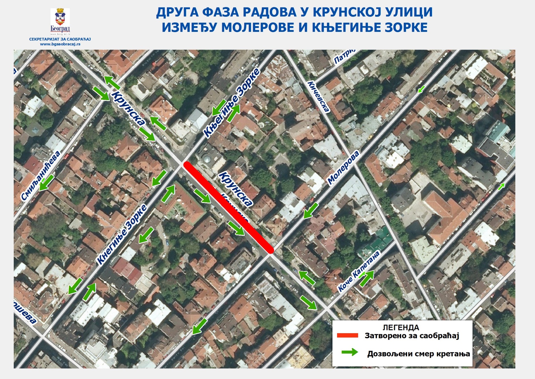 Од сутра почиње друга фаза радова на поправци инсталација топловода у Крунској улици у оквиру које ће за саобраћај бити затворена половина коловоза између улица Молерове и Књегиње Зорке, у смеру од Молерове ка Књегиње Зорке.
