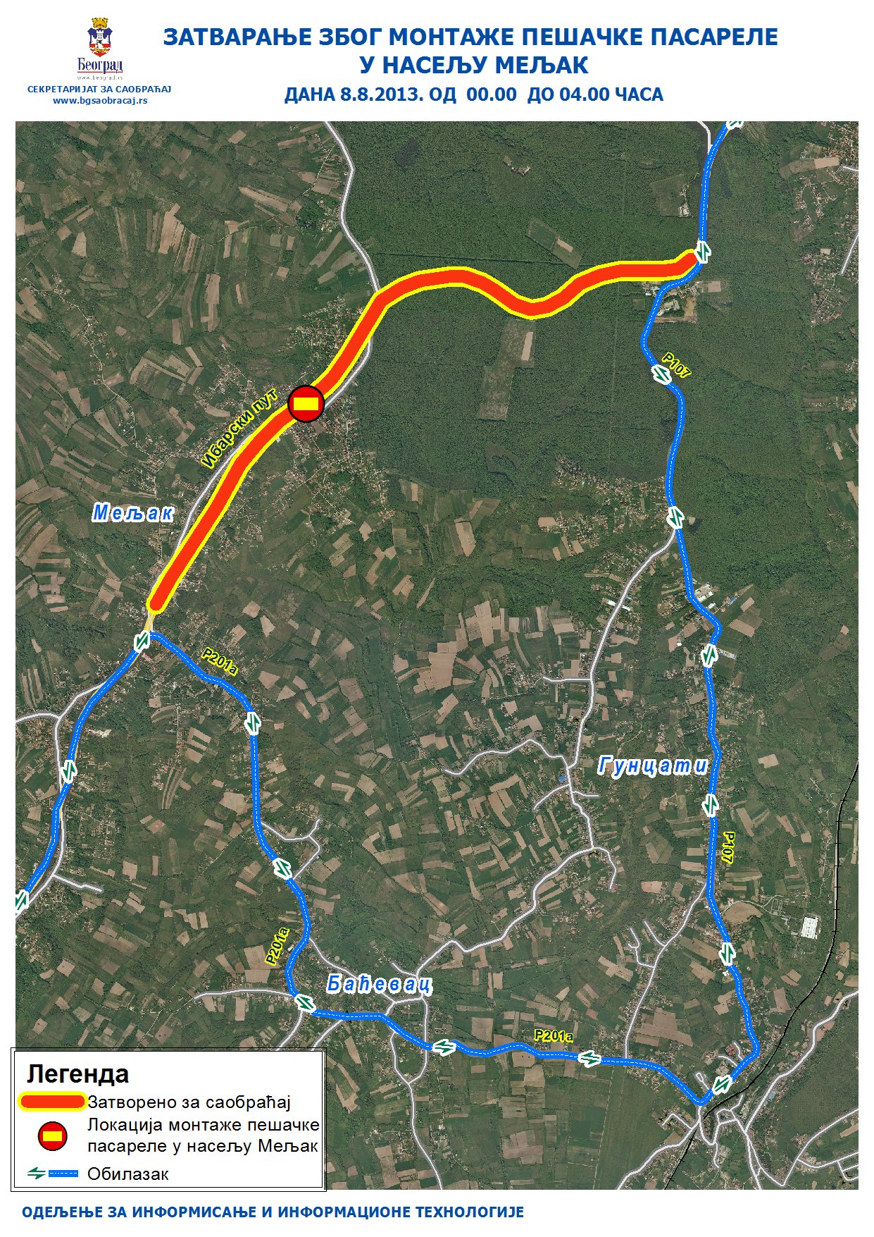 Ноћас ће због радова на постављању пешачке пасареле у насељу Мељак за саобраћај бити затворен део Ибарске магистрале који пролази кроз ово насеље и то у периоду од 00 часова до 04 часа (четвртак 08.08.2013. од 00 часова до 04 часа).Због наведених радова сва возила која пролазе Ибарском магистралом у зони насеља Мељак преусмеравају се на заобилазну трасу преко насеља Баћевац и Гунцати.