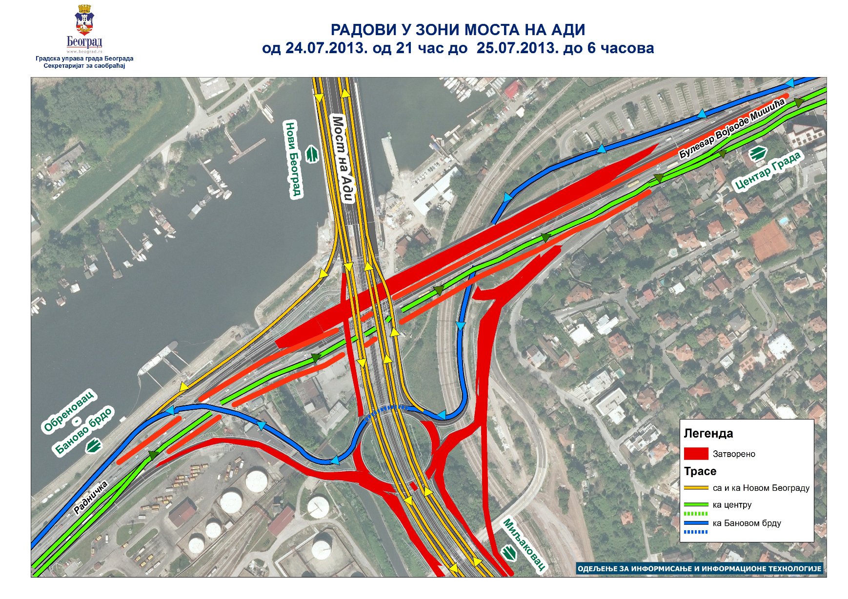 Због извођења радова на постављању носача трећег сегмента моста преко Топчидерске реке у ноћи између среде 24.07.2013. од 21 час до четвртка 25.07.2013. до 06 часова поред важећих измена доћи ће до додатних измена режима саобраћаја
