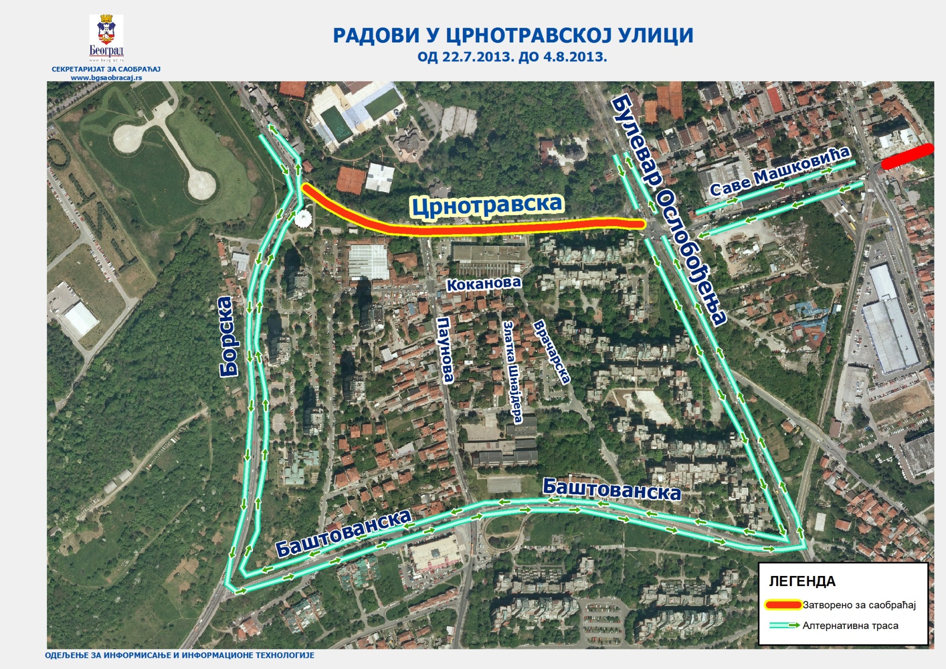 Због радова на замени коловозне конструкције за саобраћај ће бити затворен део Црнотравске улице између Борске улице и Булевра ослобођења од понедељка 22.07.2013. до 04.08.2013. године. На раскрсницама Црнотравска - Булевар ослобођења и Црнотравска – Борска сва возила се преусмеравају на алтернативну трасу: Булевар Ослобођења – Баштованска – Борска – Црнотравска.Због наведених радова доћи ће до следећих измена у јавном градском превозу: