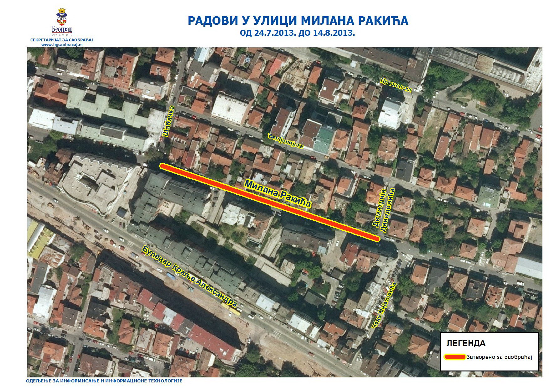 Због радова на поправци инсталација топловода за саобраћај ће бити затворен део улице Милана Ракића од улице Димитрија Давидовића до Шабачке у периоду од 24.07.2013. до 14.08.2013.Радове изводи ЈКП „Београдске електране“.