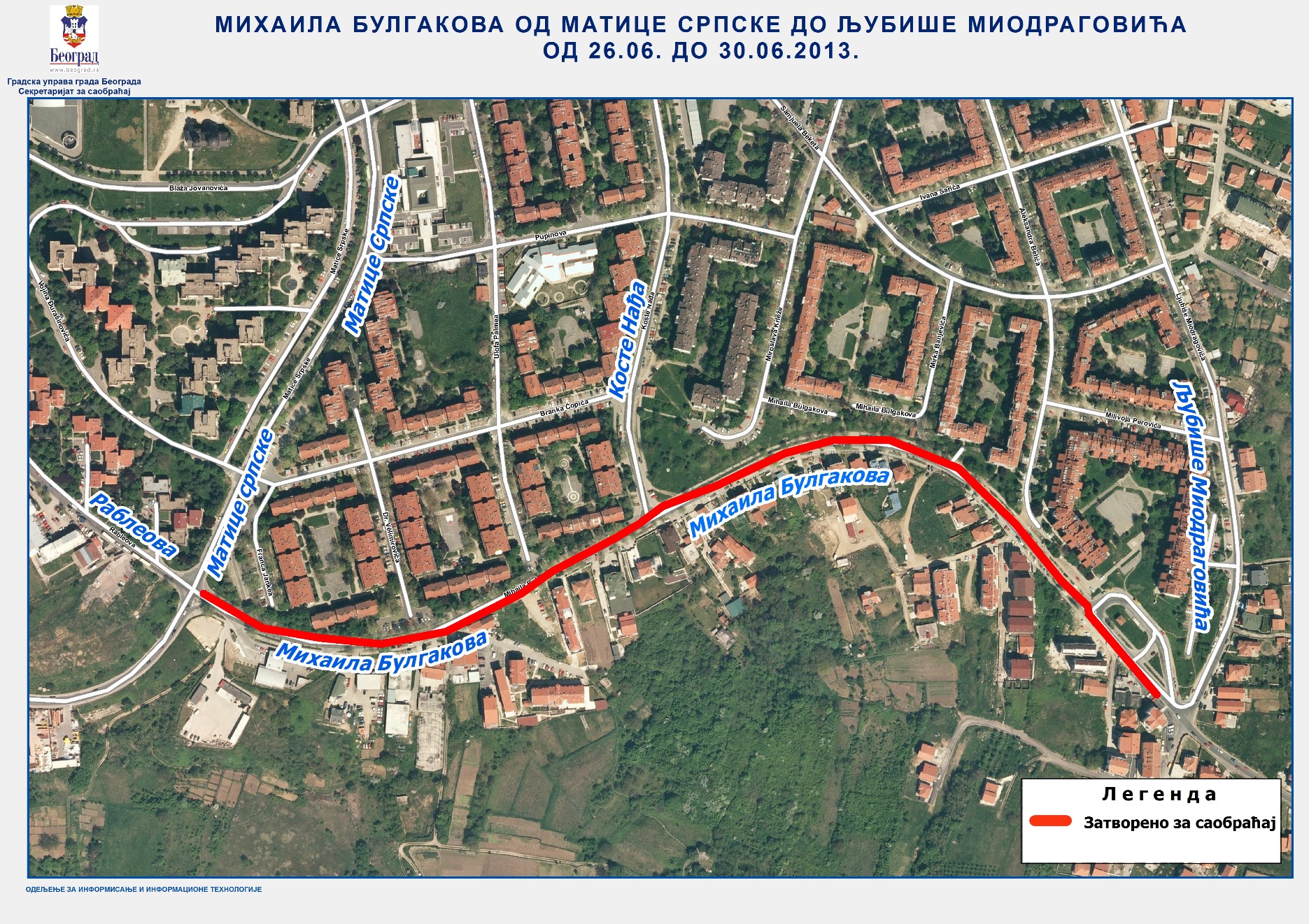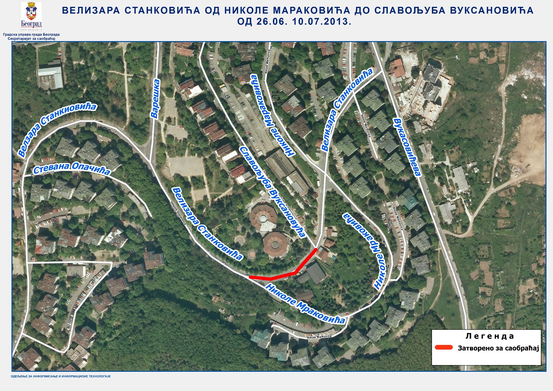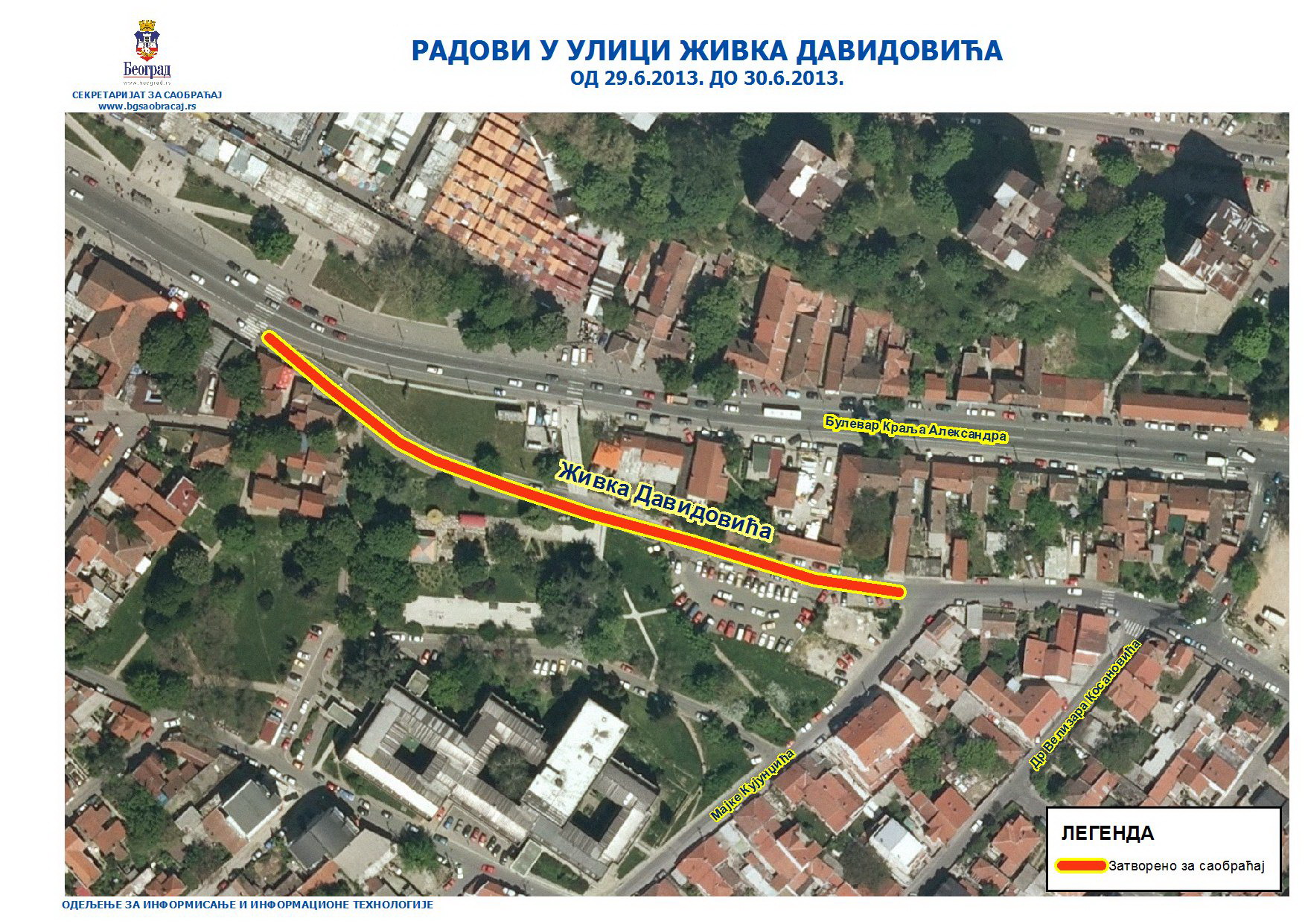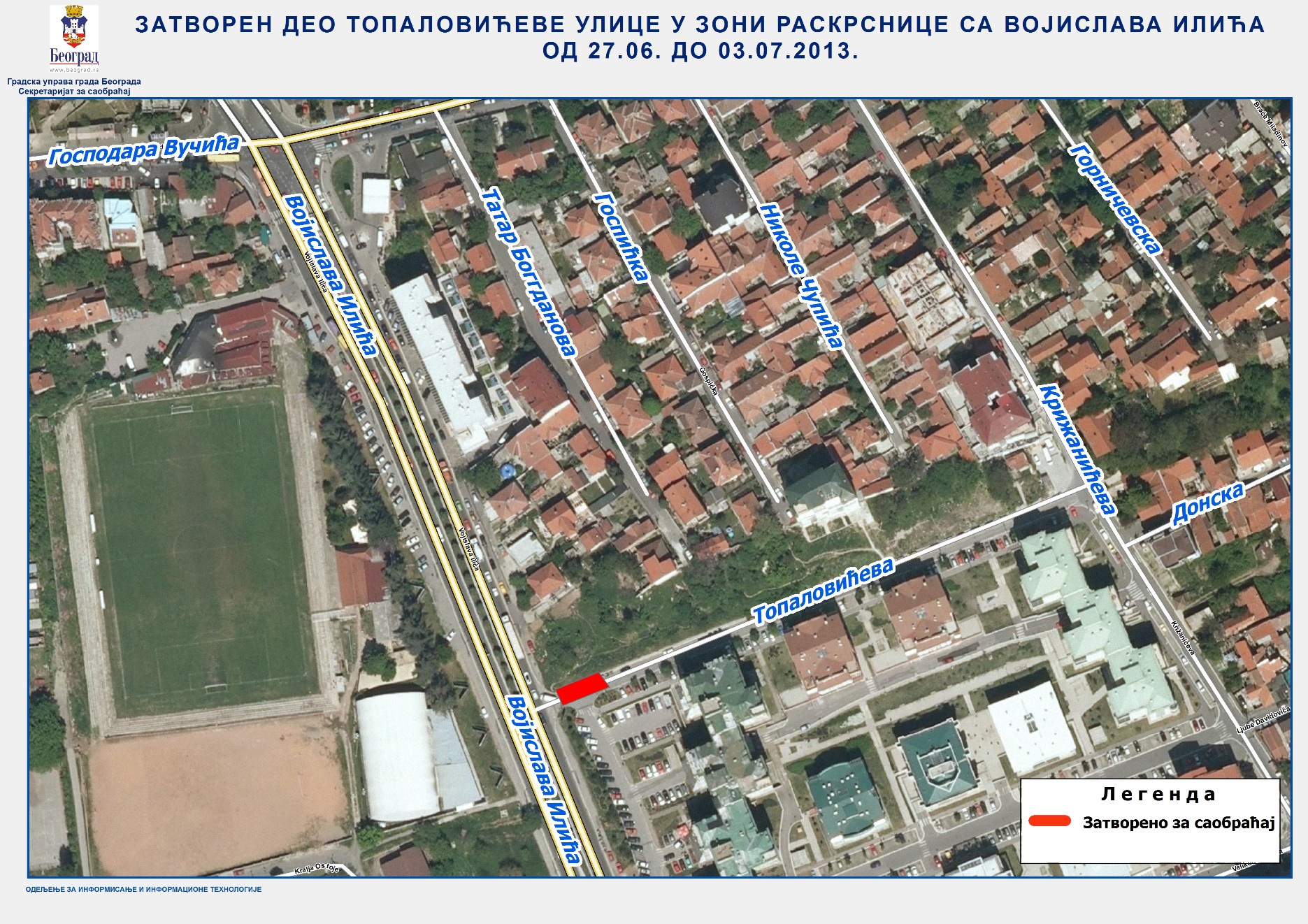 Због радова на поправци инсталација топловода за саобраћај ће бити затворен део Топaловићеве улице у зони раскрснице са улицом Војислава Илића од 27.06.2013. до 03.07.2013.