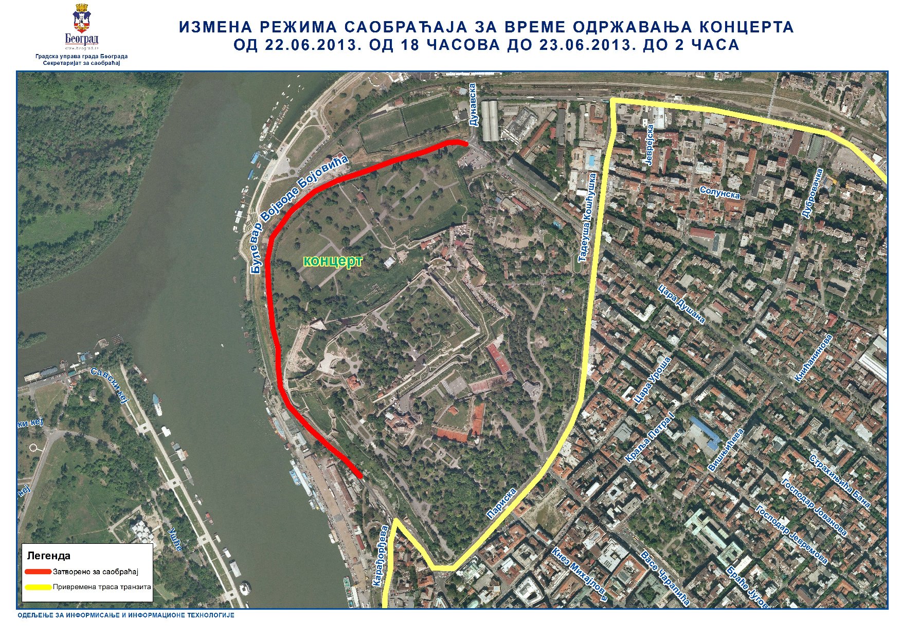 Због одржавања концерта групе „Бајага и инструктори“ од суботе 22.06.2013. од 18 часова до недеље 23.06.2013. до 02 часа на Калемегдану (Доњи град), за саобраћај је затворен Булевар војводе Бојовића