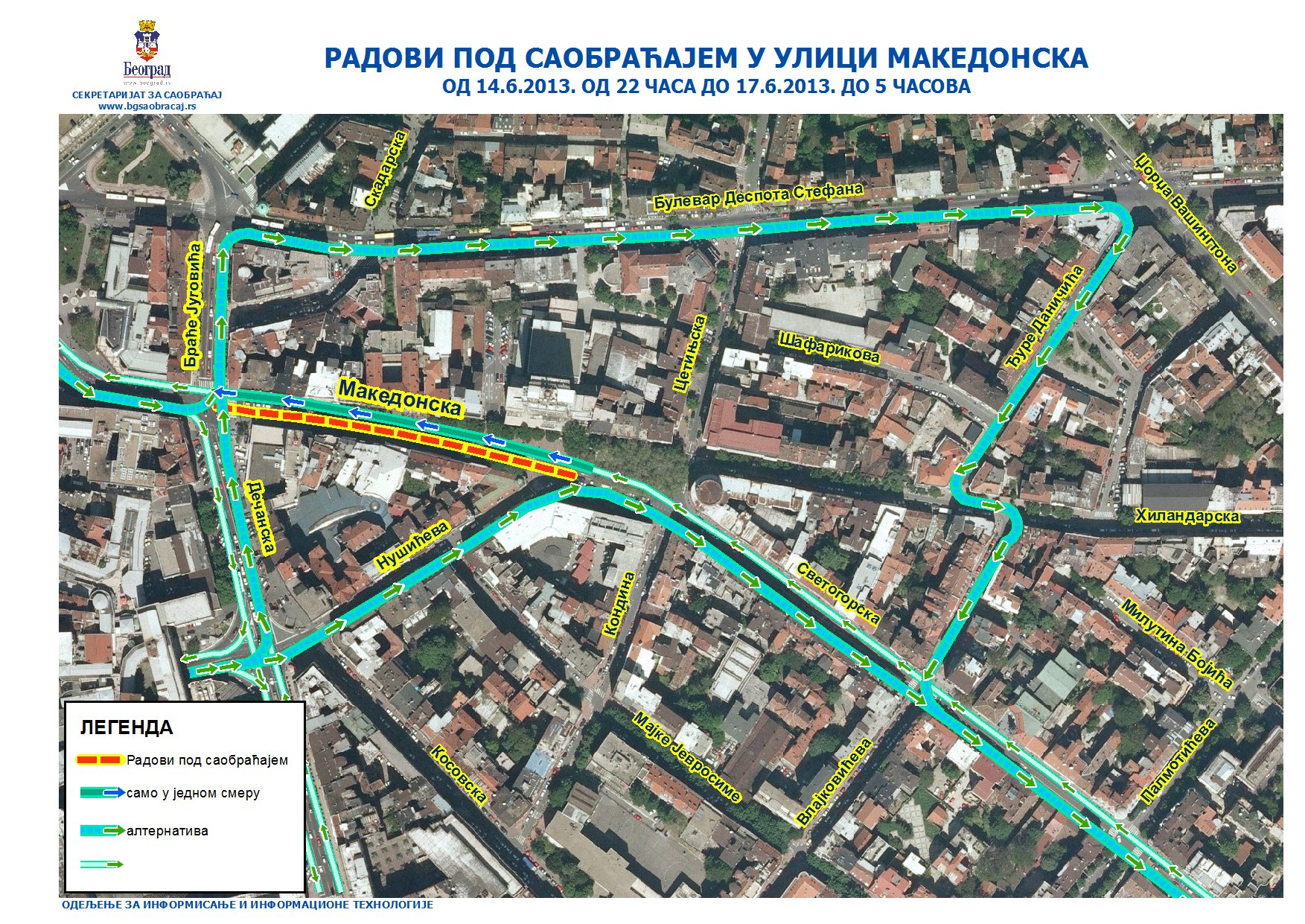 Током поправке и асфалтирања коловоза, у Улици Македонској, од раскрснице са улицама Дечанском и Браће Југовић до Улице Нушићеве, које изводи ЈКП „Београд пут“ у периоду од 14. 06. 2013. године, од 22:00 часа до 17. 06. 2013. године до 05:00 часова