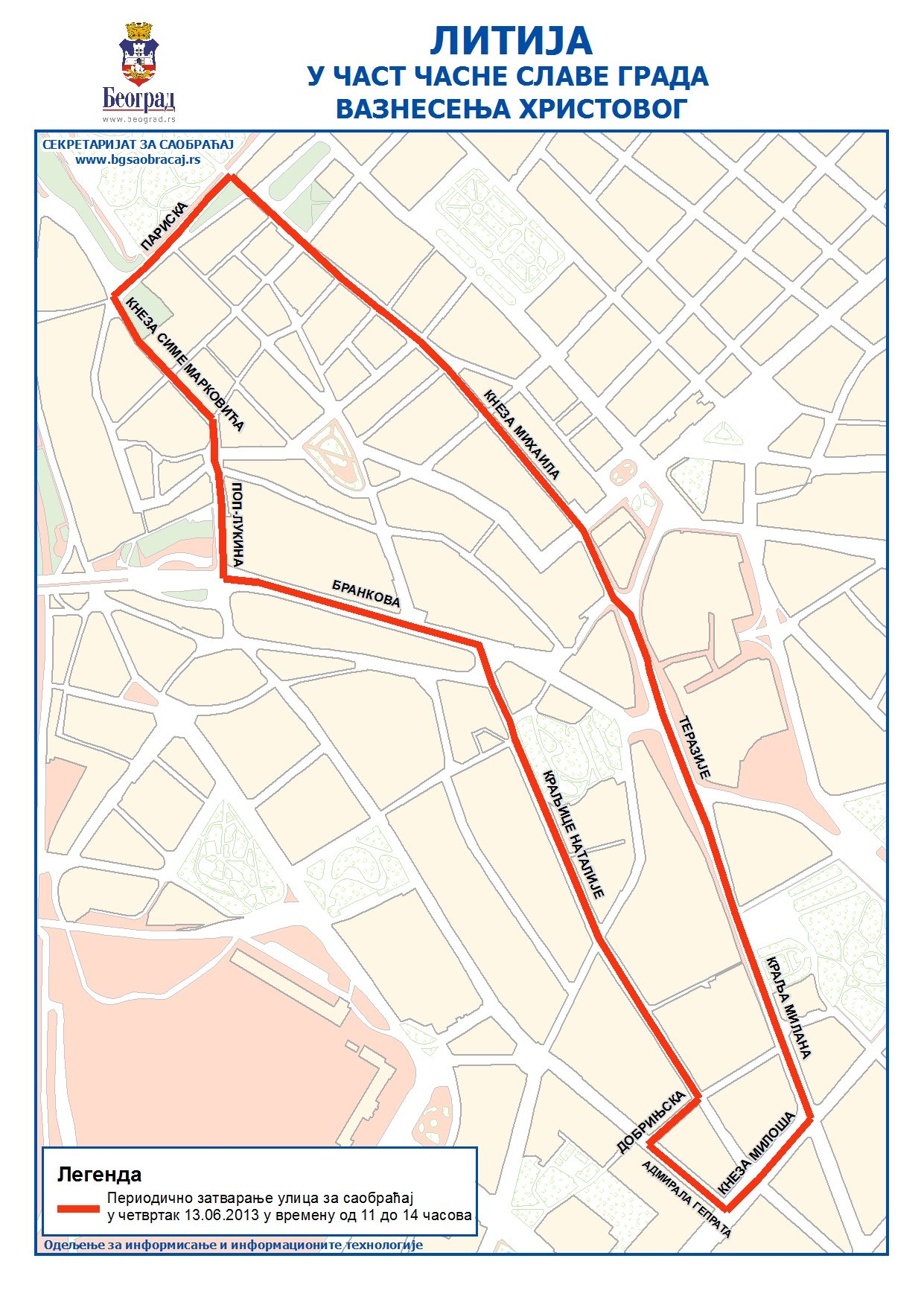 Током Литије, која се одржава у част Крсне славе Града, Вазнесења Христовог, у четвртак, 13.06.2013. године на снази ће бити посебна организација саобраћаја.