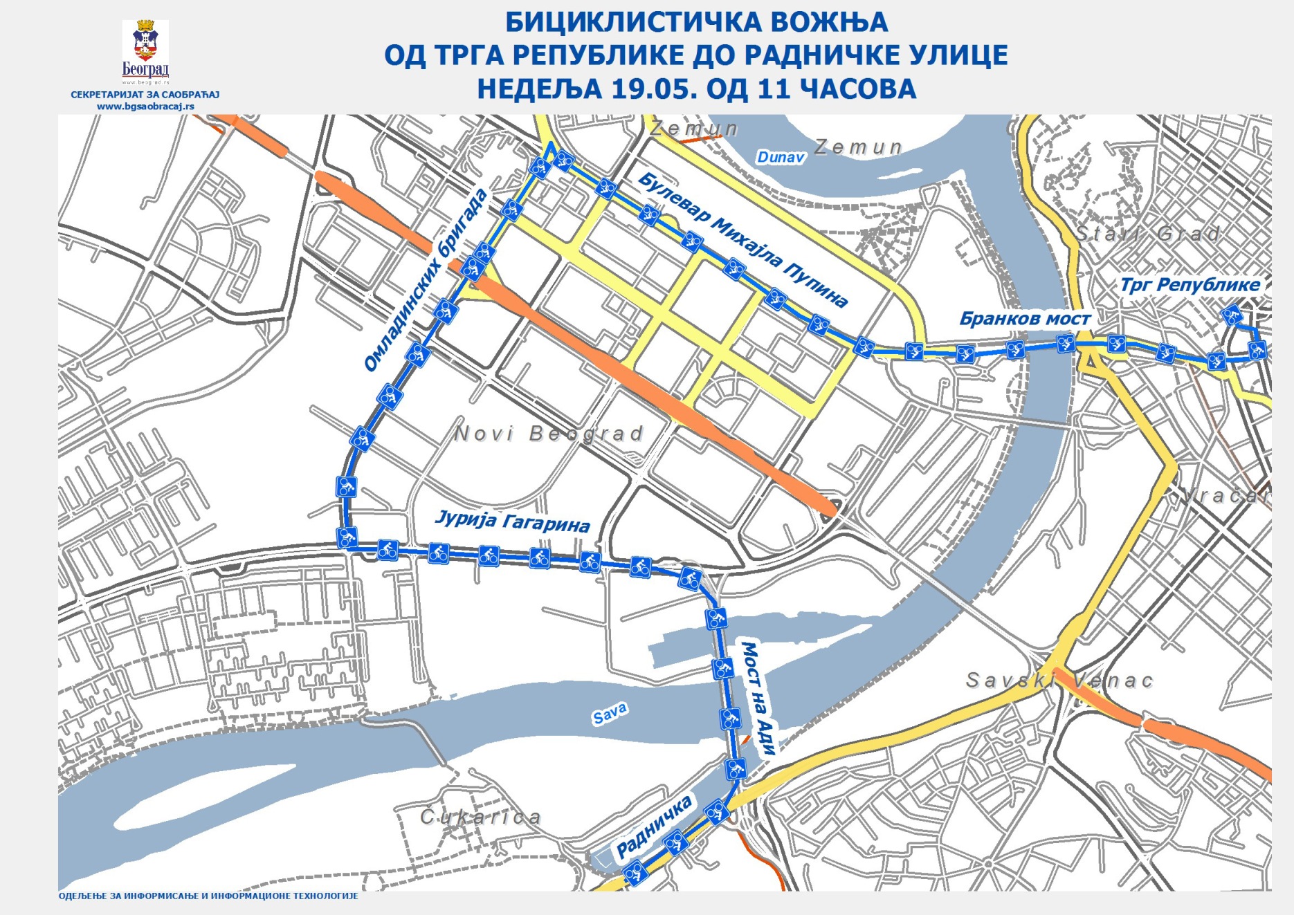 Због вожње бицикла од Трга Републике до Радничке улице у недељу 19.05.2013. од 11 часова доћи ће до повремене обуставе саобраћаја на следећој траси: Трг Републике – Македонска – Дечанска – Теразијски тунел – Бранкова – Бранков мост – Булевар Михајла Пупина – Омладинских бригада – Јурија Гагарина – Мост на Ади - Радничка.