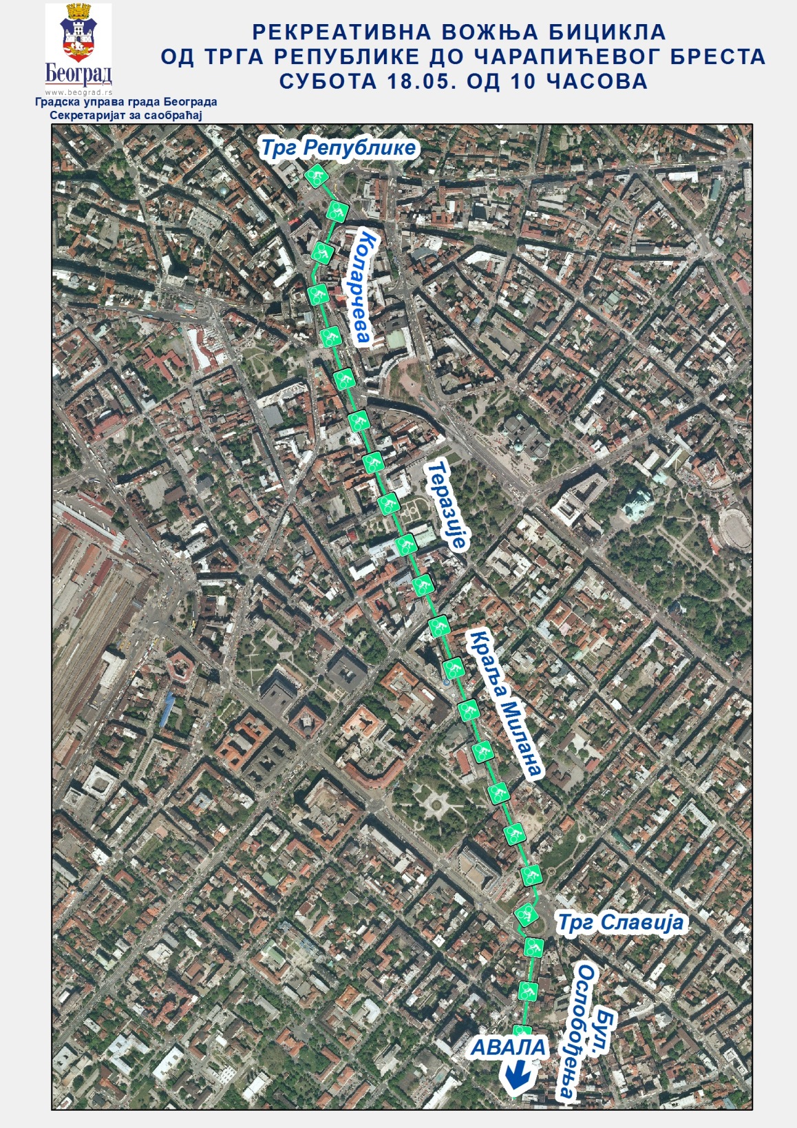 Због рекреативне вожње бицикла од Трга Републике до Чарапићевог бреста у суботу 18.05.2013. од 10 часова доћи ће до повремене обуставе саобраћаја на следећој траси: Трг Републике – Коларчева - Краља Милана - Трг Славија - Булевар Ослобођења - Трг Ослобођења - Булевар Ослобођења - Авалски пут - Авала- Врх Авале - Авалски торањ - Чарапићев брест.