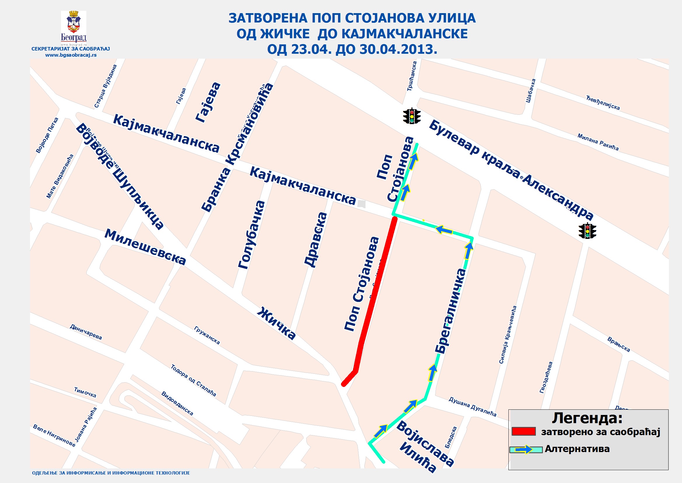 Због радова на санацији канализционог прикључка које ће изводити Ј.К.П. „Београдски водовод и канализација“ за саобраћај ће бити затворен део Поп Стојанове улице од Жичке до Кајмачаланске у периоду од сутра 23.04.2013. до 30.04.2013. године.Возила која су до сада користила Поп Стојанову улицу за кретање узмеђу улица Жичке и Кајмакчаланске упућују се на алтернативну трасу кроз Брегалничку улицу.