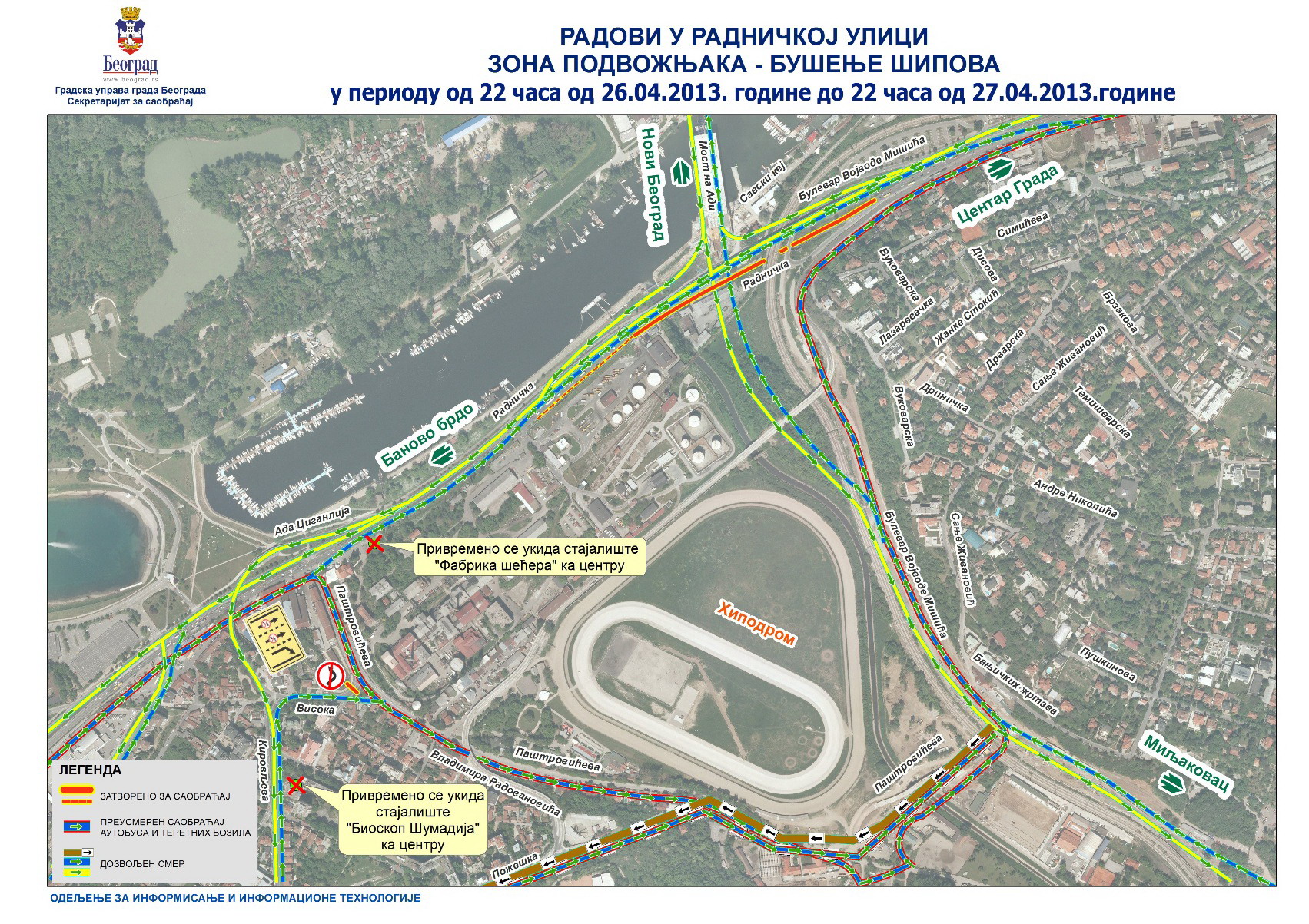 Због извођења радова на бушењу шипова у Радничкој улици у периоду од петка 26.04.2013. од 22 часа до суботе 27.04.2013. до 22 часа за саобраћај ће бити затворен подвожњак у овој улици.