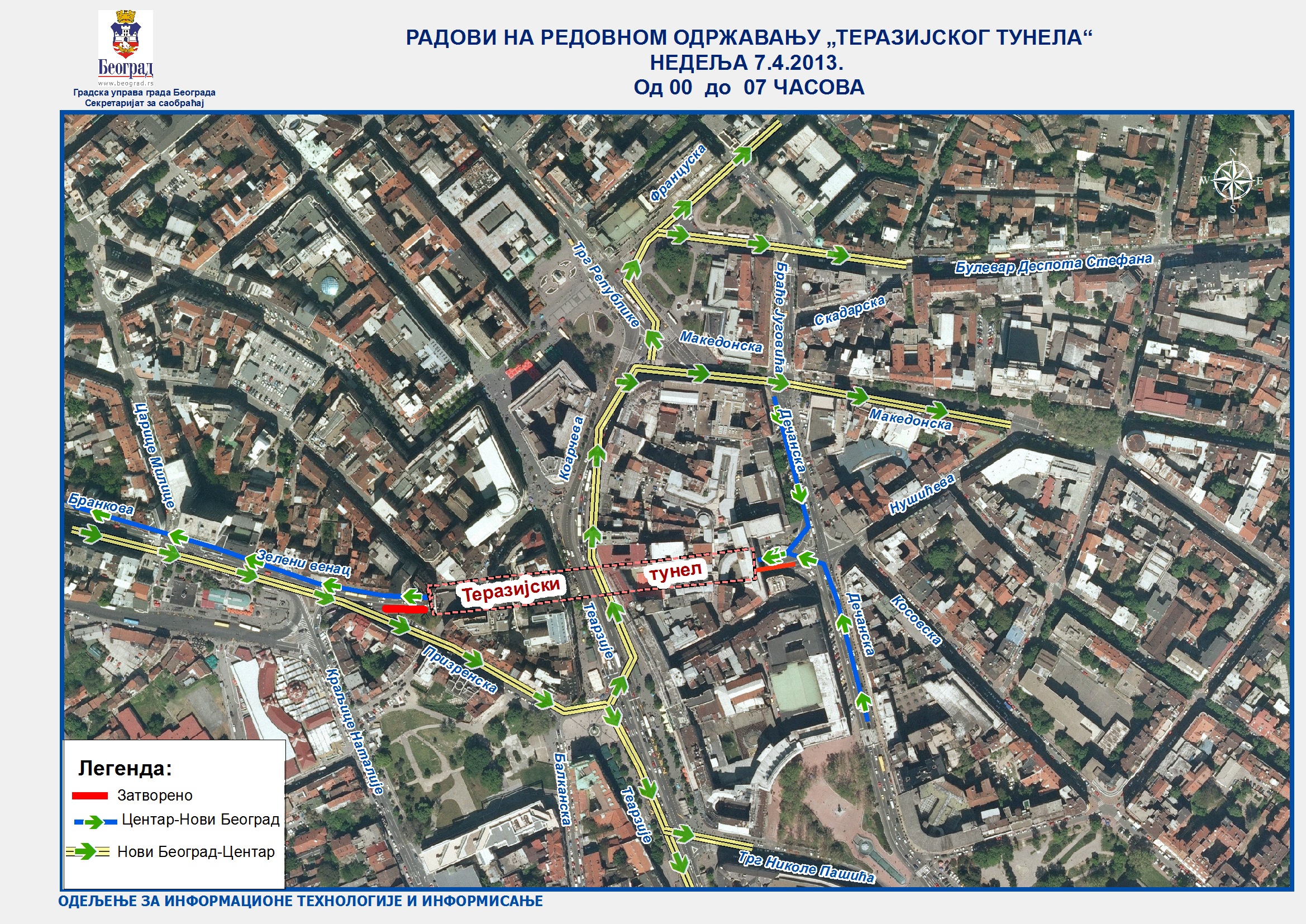 У недељу 07.04.2013. од 00 часова до 07 часова за саобраћај ће бити затворена половина „Теразијског тунела“ у смеру од Зеленог венца ка Дечанској улици, због извођења радова на замени мермерних плоча на објекту у Дечанској број 8.