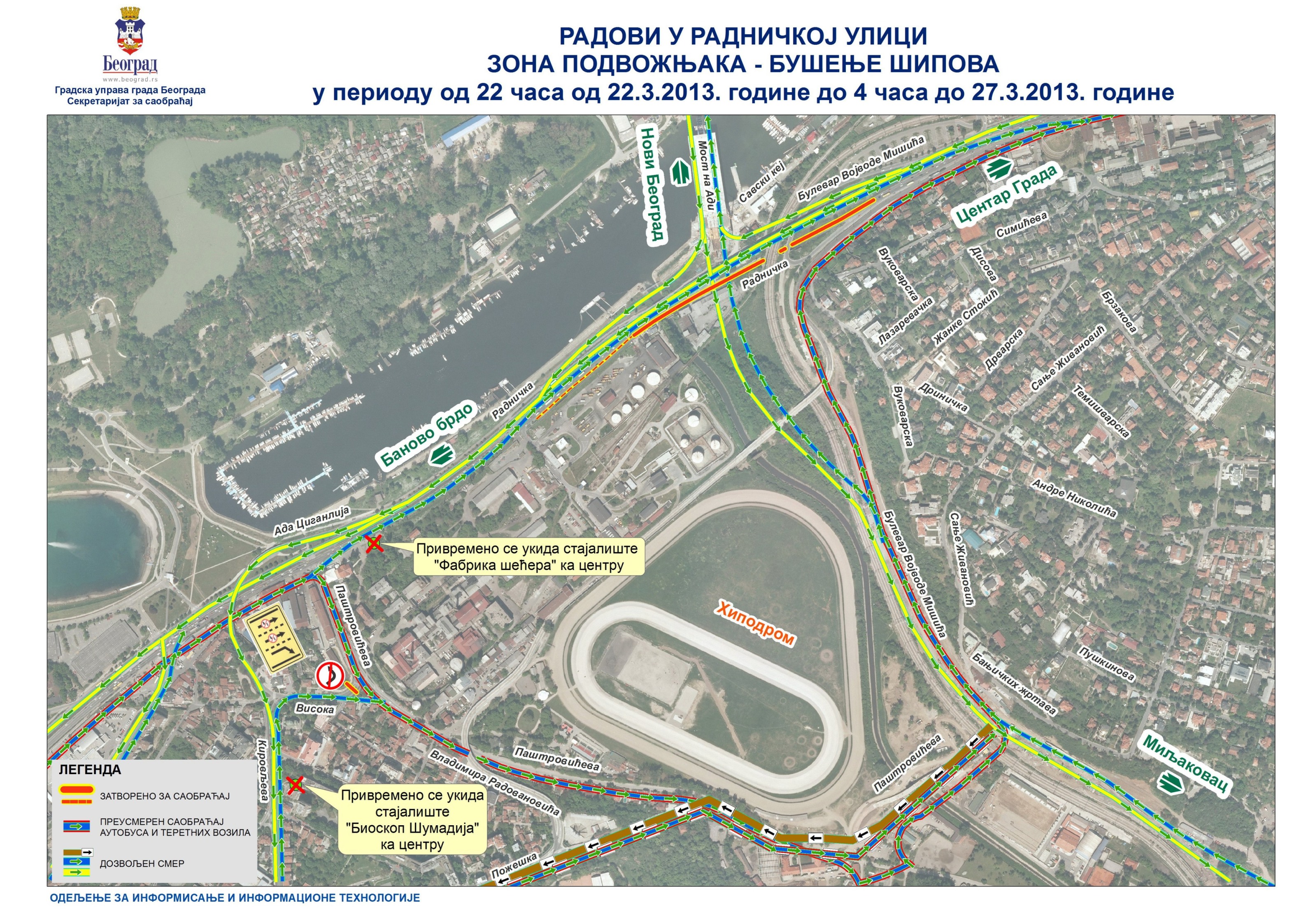 Због извођења радова на бушењу шипова у Радничкој улици у периоду од петка 22.03.2013. од 22 часа до среде 27.03.2013. до 4 часа за саобраћај ће бити затворен подвожњак у овој улици.