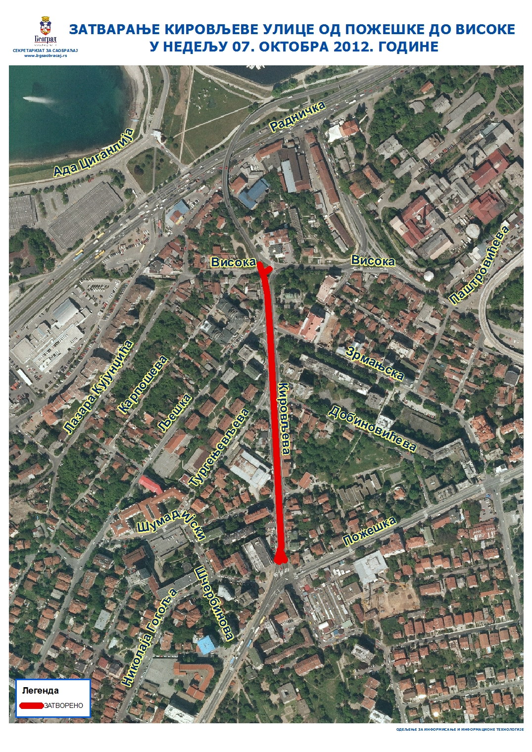 Током извођења радова у оквиру редовног одржавања биће затворена Кироровљева улица, на делу од Пожешке улице до улице Висока, у недељу 7.10.2012. године од 7 часова до 22 часа.Возила јавног превоза пропуштају се кроз зону радова до алтернативне трасе Љешком улицом.