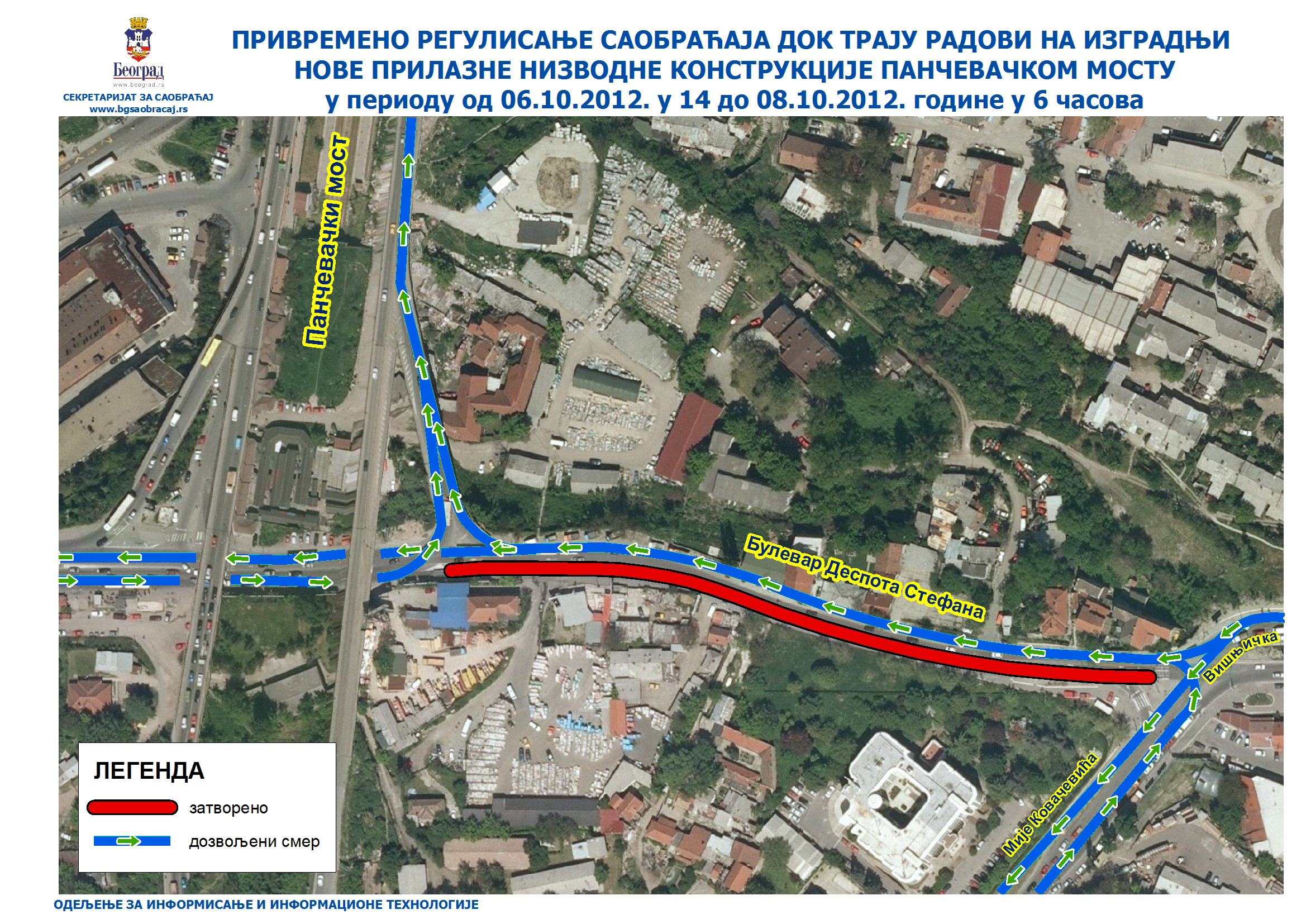 Oд суботе од 14 часова до понедељка ујутру до 6 часова, због радова на изградњи узлазне рамапе на Панчевачки мост и приступних саобраћајница биће затворен део Булевара деспота Стефана између узлазне рампе на Панчевачки мост и раскрснице улица Мије Ковачевића-Вишњичка.Сва возила која долазе из смера центра града и желе да продуже у Вишњичку улицу у овом периоду на раскрсници Булевар деспота Стефана - Митрополита Петра усмеравају се Опширније