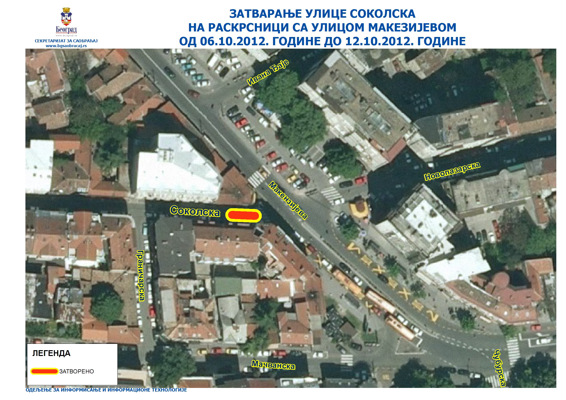 Током извођења радова које ће изводити Ј.К.П. „Београдске електране“ биће затворен део Соколске улице испред раскрснице са Мекензијевом улицом. Радови ће трајати од 06.10.2012. до 12.10.2012.