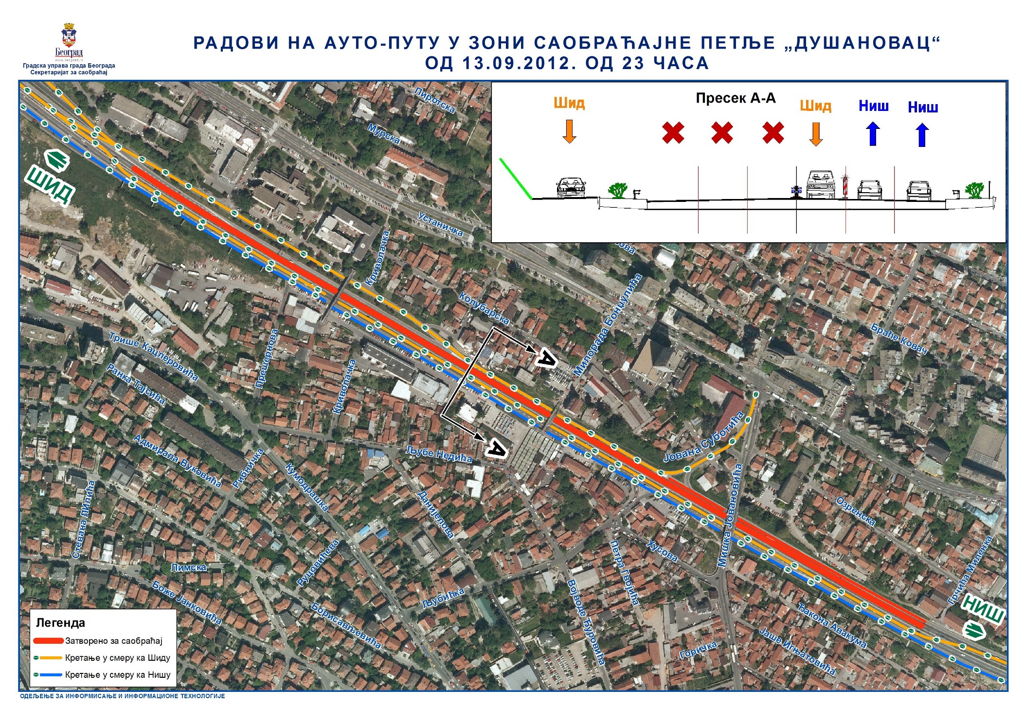Према најави Ј.П. „Путеви Србије“ због радова на рехабилитацији коловоза аутопута Е-75 на проласку кроз Београд у зони саобраћајне петље „Душановац“ од 13.09.2012. од 23:00 часова за саобраћај ће бити затворена једна половина ауто-пута и то у смеру од Ниша ка Шиду. Планирано је да радови трају месец дана и да се обављају по фазама.