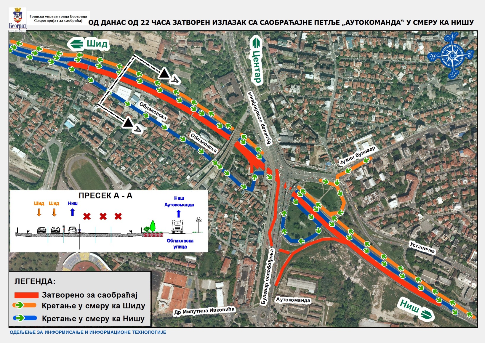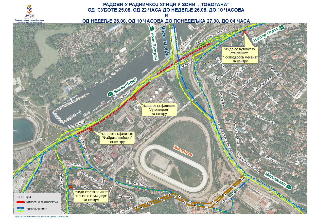 1. Због затварања надвожњака („Тобоган“) возила која се крећу из смера центра града ка Бановом брду и Обреновцу, преусмеравају се у подвожњак у зони хале XIV Београдског сајма, а код „Југопетрола“ враћају се у саобраћајне траке намењену овом смеру кретања.