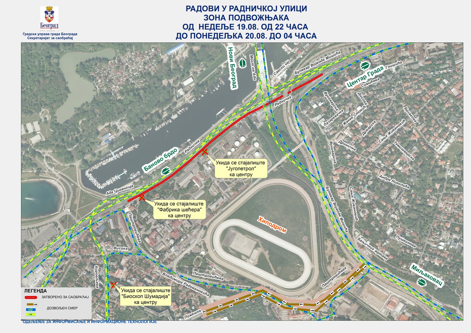 1. Затвара се за саобраћај део Радничке улице, у смеру од Бановог брда (Обреновца) ка центру града (Београдском сајму) и то у делу од Паштровићеве улице до подвожњака у Радничкој улици.