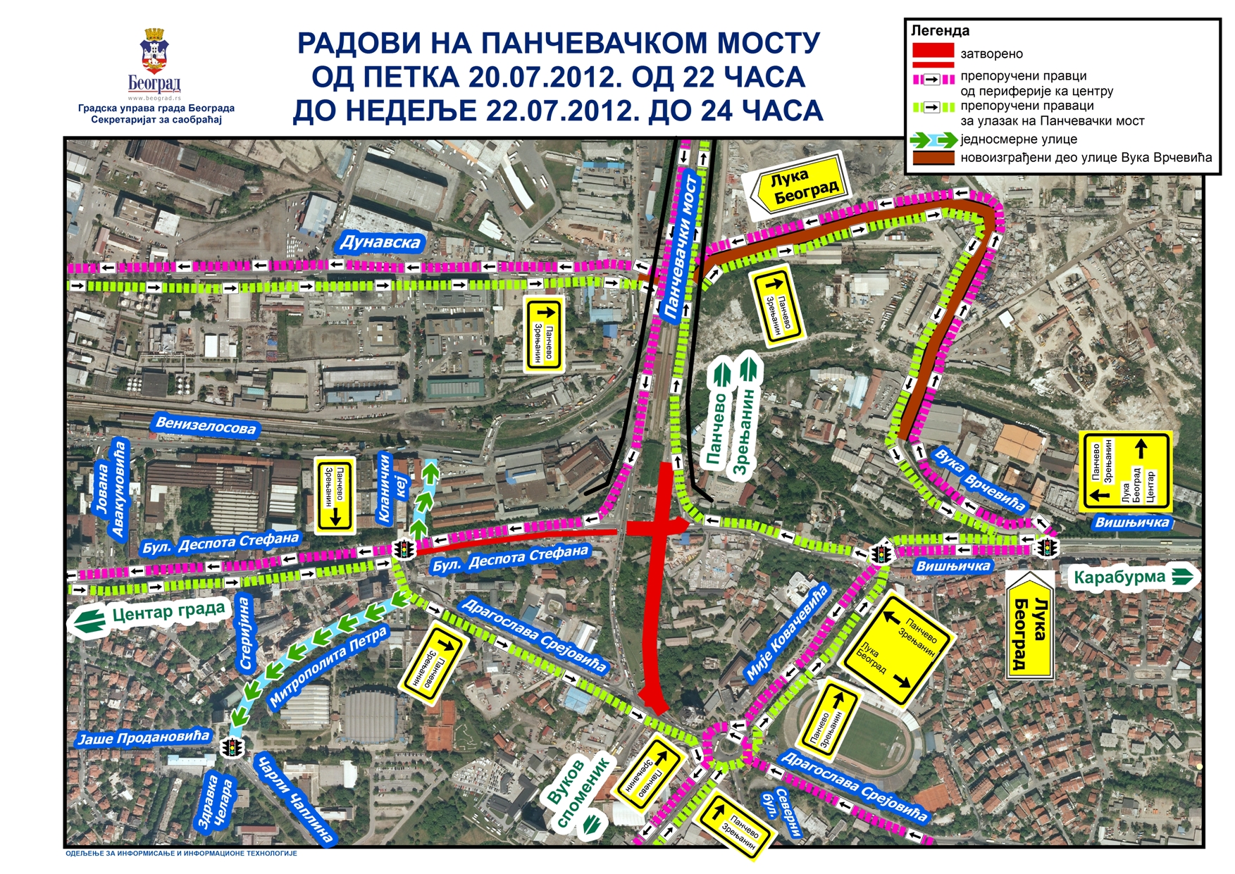 - Због извођења радова препоручујемо да возила која долазе из Митрополита Петра на раскрсници Митрополита Петра – Драгослава Срејовића скрену лево ка Булевару деспота Стефана, а затим десно у Булевар деспота Стефана ка Панчевачком мосту.