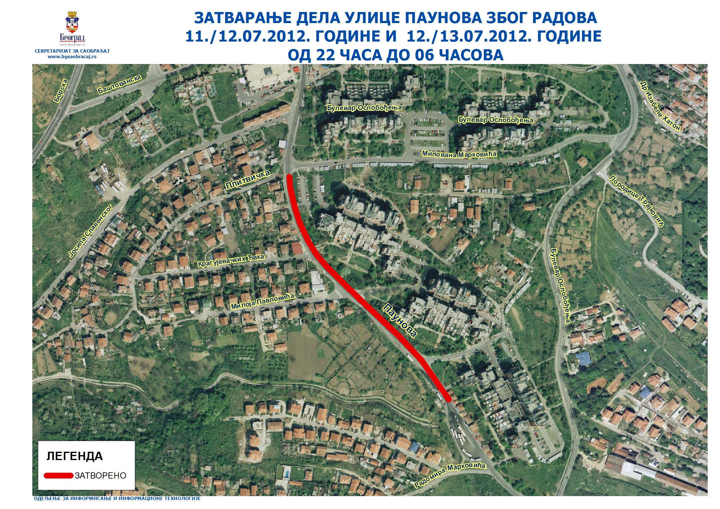 У Пауновој улици, на делу од Плитвичке улице до тролејбуске окретнице „Бањица 2“, у периоду од 7. до 11. јула изводиће се радови на поправци и асфалтирању коловоза под саобраћајем.