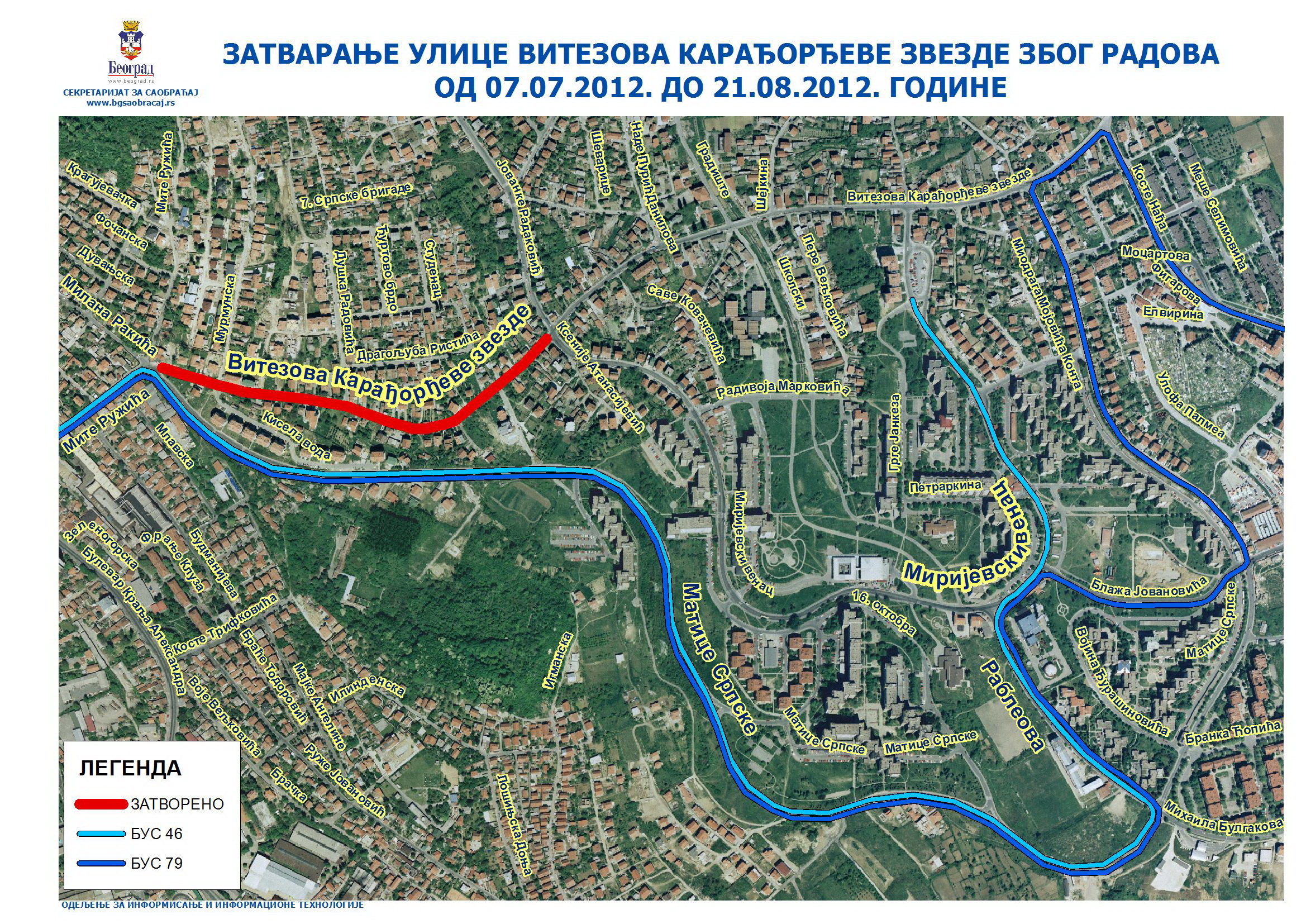 За време извођења наведених радова аутобуси јавног превоза са линија број 46 и 79 уместо улицом Витезова Карађорђеве звезде кретаће се делимично измењеном трасом на следећи начин: