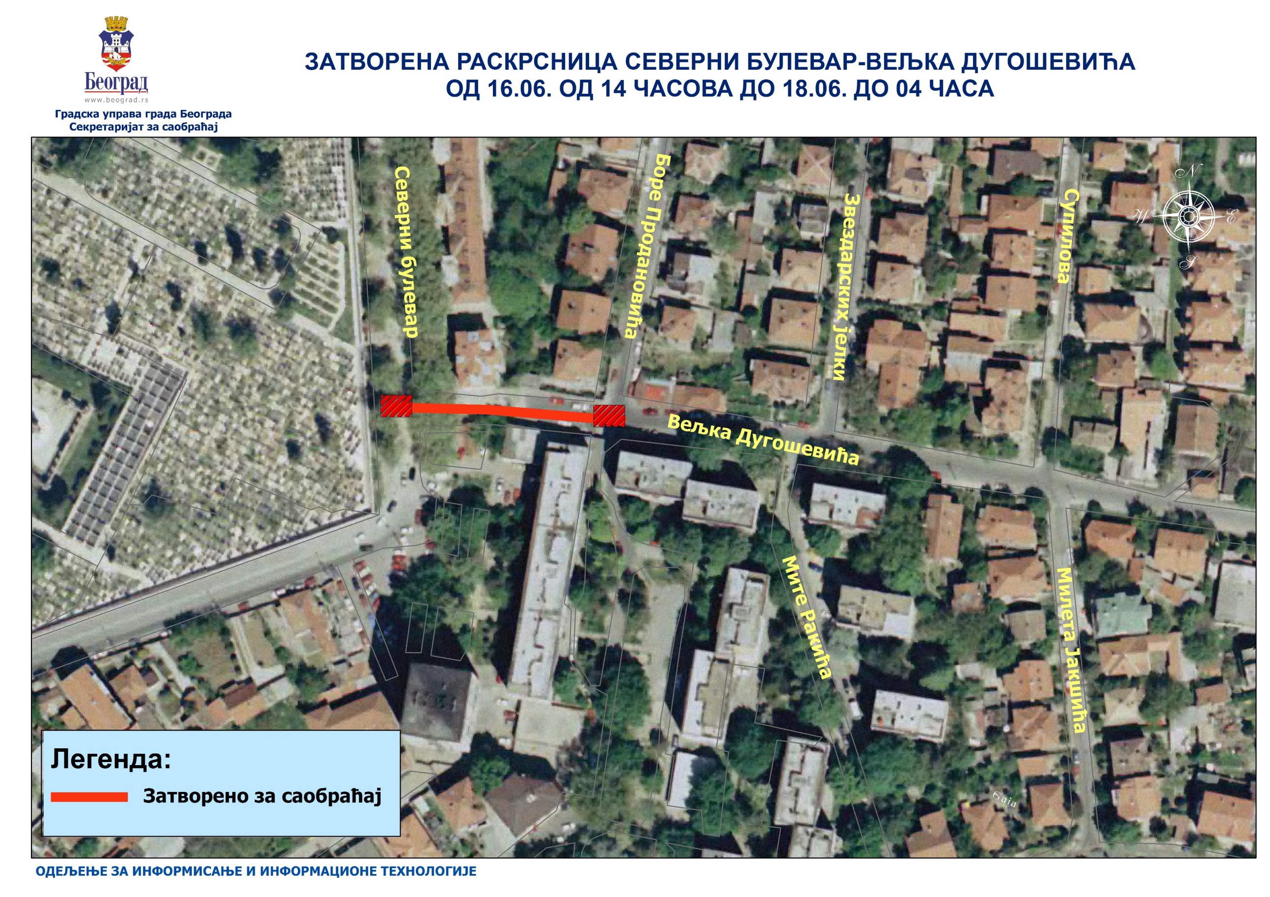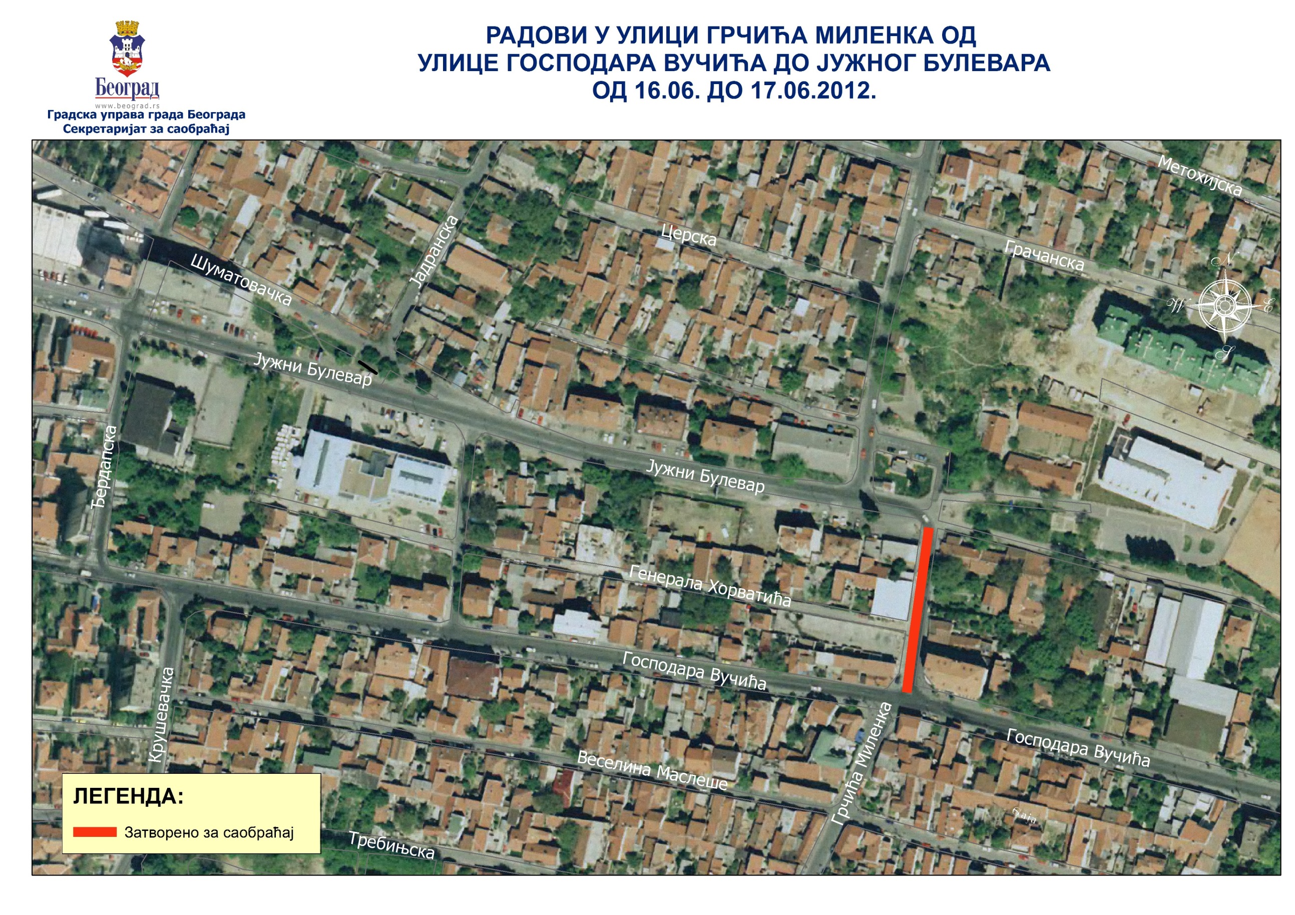 Због извођења радова на асфалтирању коловоза у суботу 16.06. и недељу 17.06. јуна, за саобраћај се затвара део улице Грчића Миленка, од улице Господара Вучића до Јужног Булевара.