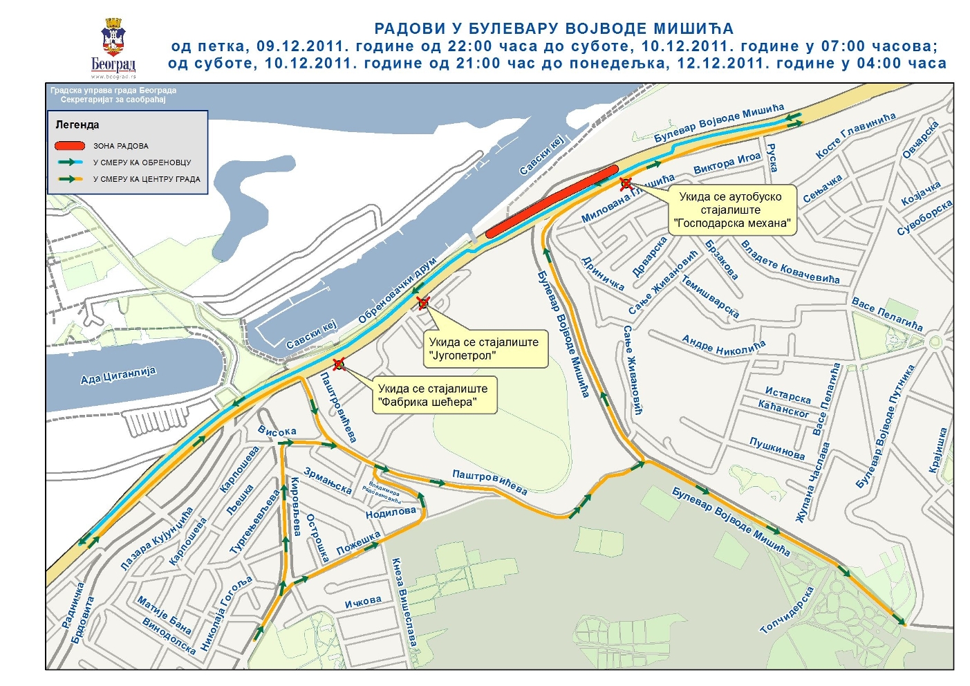 Због измештања постојећег челичног цевовода ДН 900 на потезу од новопројектованог прикључног шахта који се налази насупрот „ЈУГОПЕТРОЛА“ до новопројектованог шахта у Булевару војводе Мишића насупрот „Господарске механе“ и асфалтирања надвожњака код Београдског сајма („Тобогана“) које ће се изводити у следећим интервалима: од петка, 09.12. 2011. године од 22:00 часа до суботе, 10.12. 2011. године у 07:00 часова; од суботе, 10.12. 2011. године од 21:00 час до понедељка, 12.12.2011. године у 04:00 часа, доћи ће до следећих измена у режиму саобраћаја у Радничкој улици, између Паштровићеве