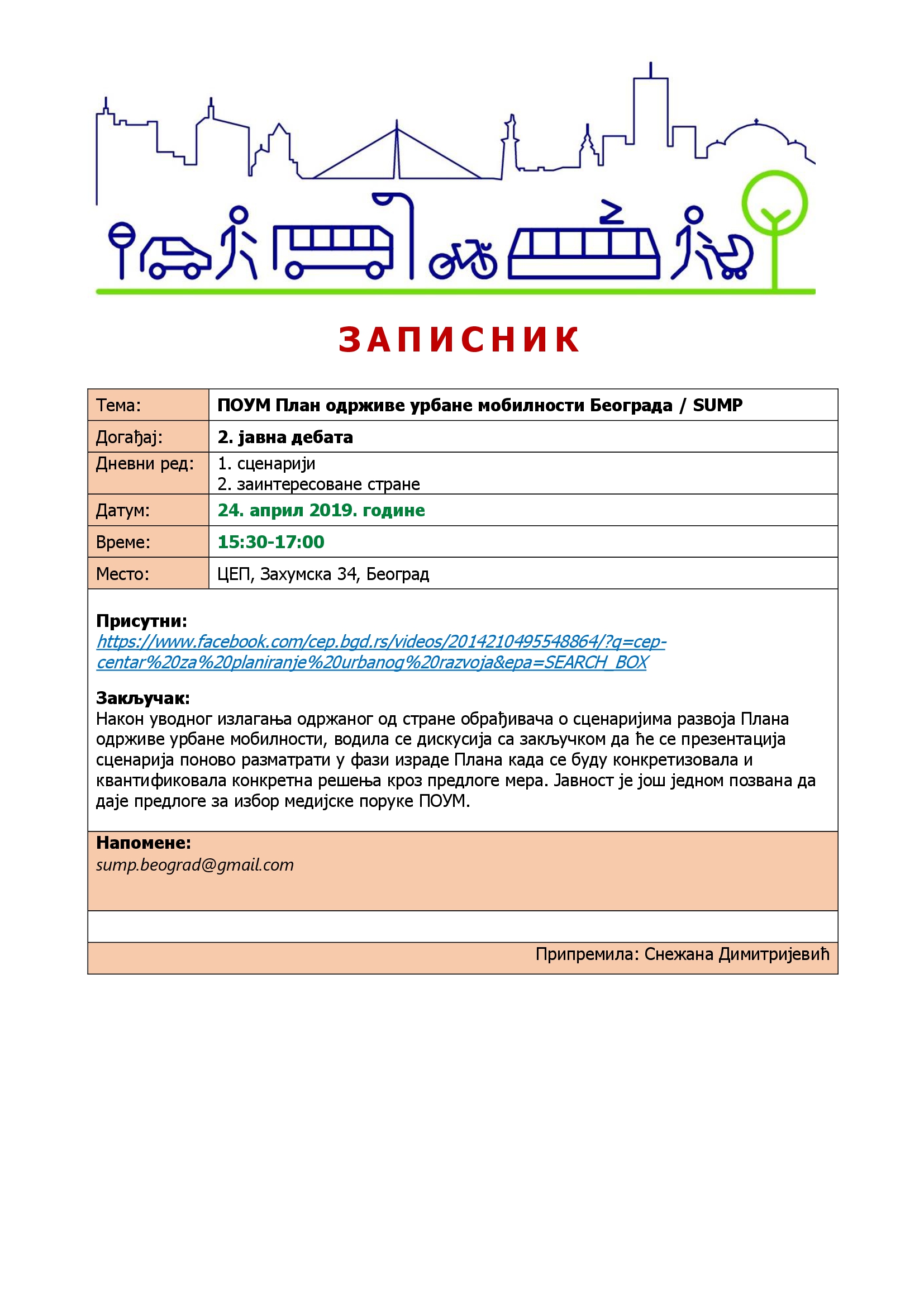 Након уводног излагања одржаног од стране обрађивача о сценаријима развоја Плана одрживе урбане мобилности, водила се дискусија са закључком да ће се презентација сценарија поново разматрати у фази израде Плана када се буду конкретизовала и квантификовала конкретна решења кроз предлоге мера. Јавност је још једном позвана да даје предлоге за избор медијске поруке ПОУМ.