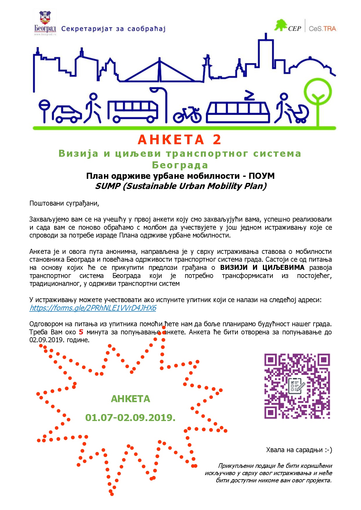 Анкета је анонимна и део је Плана Одрживе Урбане Мобилности - ПОУМ који се ради за Београд. Направљена је у сврху истраживања ставова о мобилности становника Београда и повећања одрживости транспортног система града. Састоји се од питања на основу којих ће се прикупити предлози грађана о ВИЗИЈИ И ЦИЉЕВИМА развоја транспортног система Београда који је потребно трансформисати из постојећег, традиционалног, у одрживи транспортни систем.
