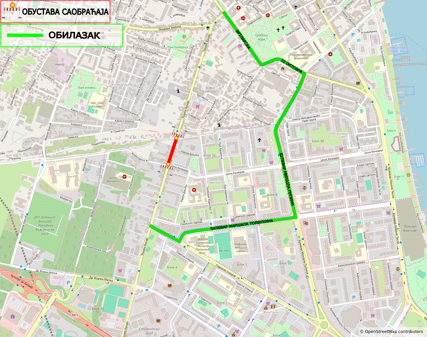 Током радова, које изводи Град Београд за потребе Дирекцијe за грађевинско земљиште и изградњу Београда Ј.П., биће измењен режим саобраћаја у ул. Маршала Толбухина у зони бр. 93, у временском периоду од 26. 11. 2025. до 27. 11. 2025. године, док ће у ул. Тошин бунар, саобраћај бити обустављен, између улица Зеленгорске и Жарка Миладиновића, у временском периоду од 28. 11. 2025. до 30. 12. 2025. године.