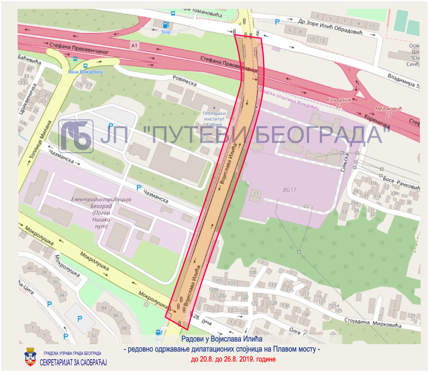 Током радова на редовном одржавању дилатационих спојница које изводе ЈП „Путеви Београда“, биће измењен режим саобраћаја у ул. Војислава Илића - Плави мост - у периоду од 20.08. до 26.08.2019. године.