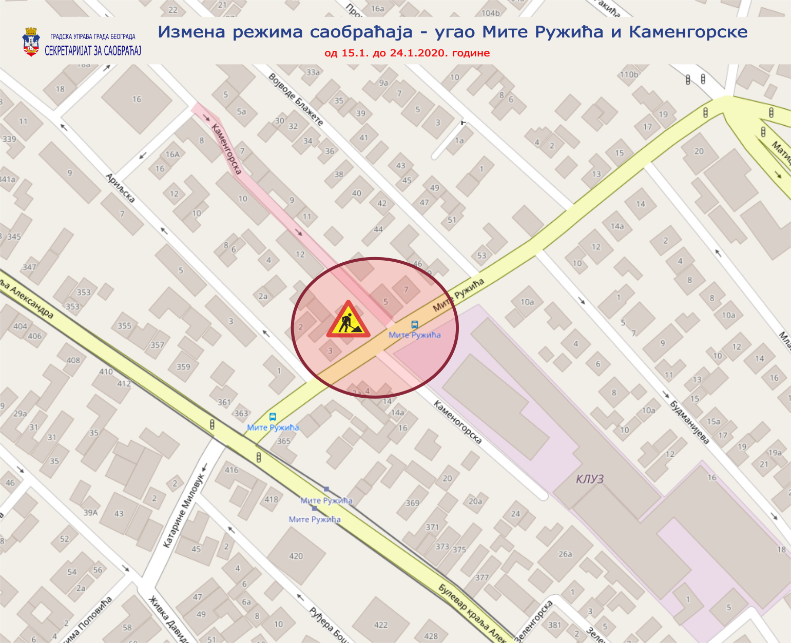 - I Фаза: Измена режима саобраћаја у ул. Мите Ружића угао са ул. Каменогорском и затварање саобраћаја у ул. Каменогорској угао са ул. Мите Ружића, у периоду од 15.01. до 18.01.2020.