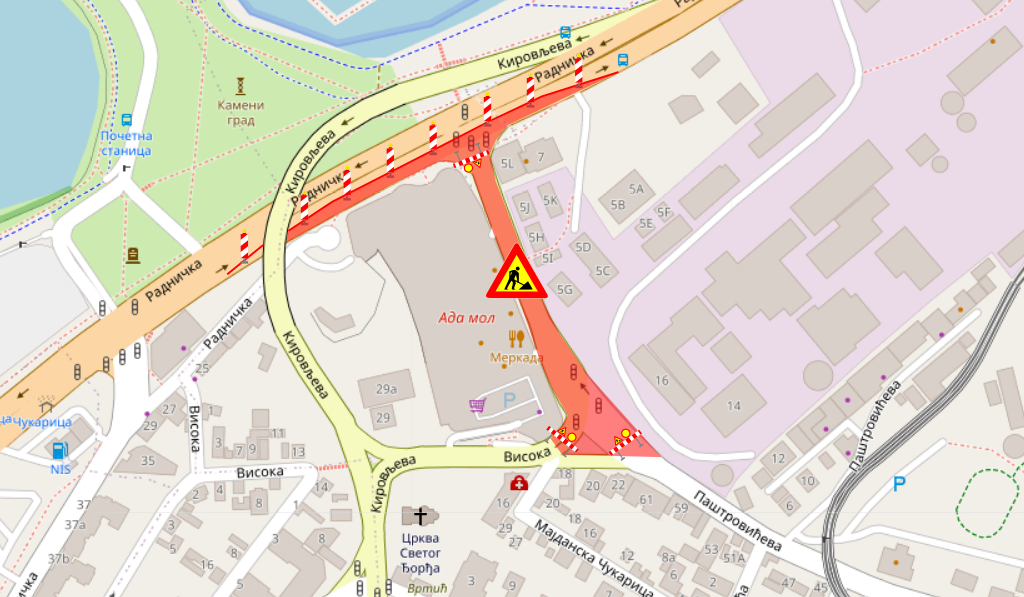 - док ће у Радничкој улици у зони раскрснице са Пештровићевом улицом у смеру од Обреновца према Сајму за саобраћај бити проходна једна саобраћајна трака.