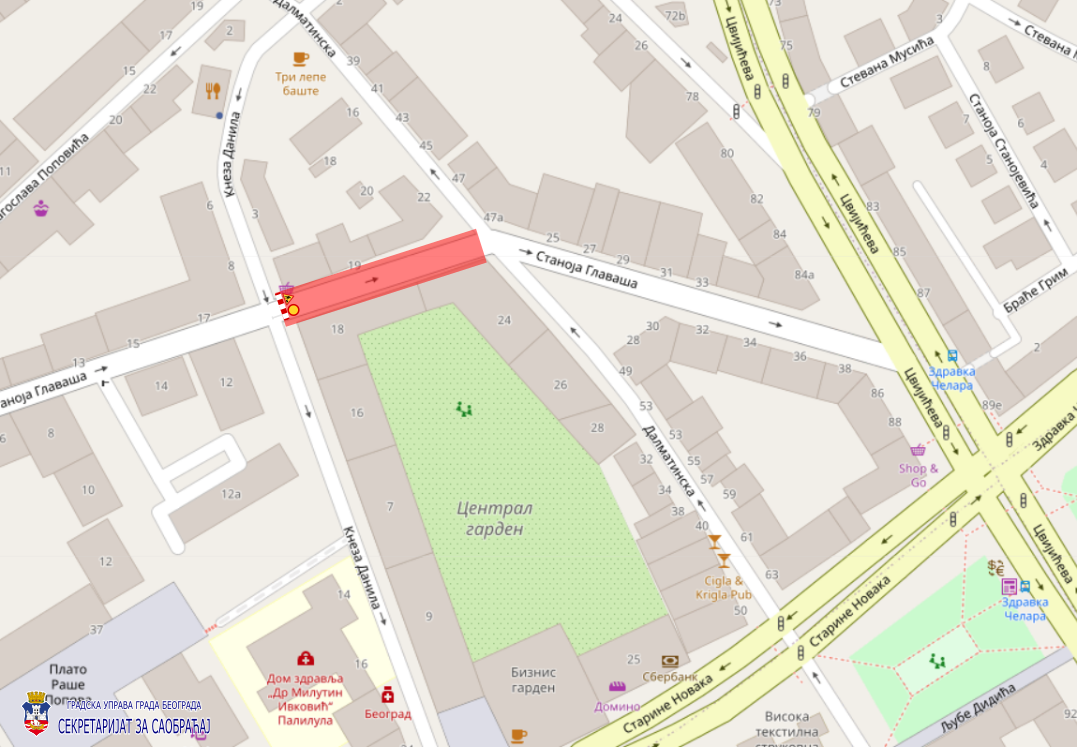 Током наставка радова на реконструкцији секундарне дистрибутивне водоводне и канализационе мреже, које изводи Дирекција за грађевинско земљиште и изградњу града Београда Ј.П. за саобраћај ће бити затворена ул. Станоја Главаша од Улице кнез Данилове до Далматинске :