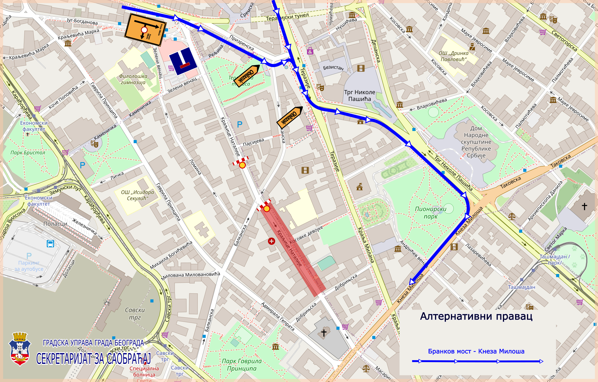 алтернативна траса : Бранкова - Призренска - Теразије - Трг Николе Пашића - Кнеза Милоша
