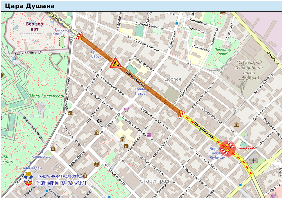 Током наставка радова у периоду од 6.11. до 12.11. 2020. године, улица Цара Душана од улице Француске до улице Капетан Мишине функционисаће у измењеном режиму саобраћаја, док ће деоница од Капетан Мишине до улице Тадеуша Кошћушка бити затворена за саобраћај.