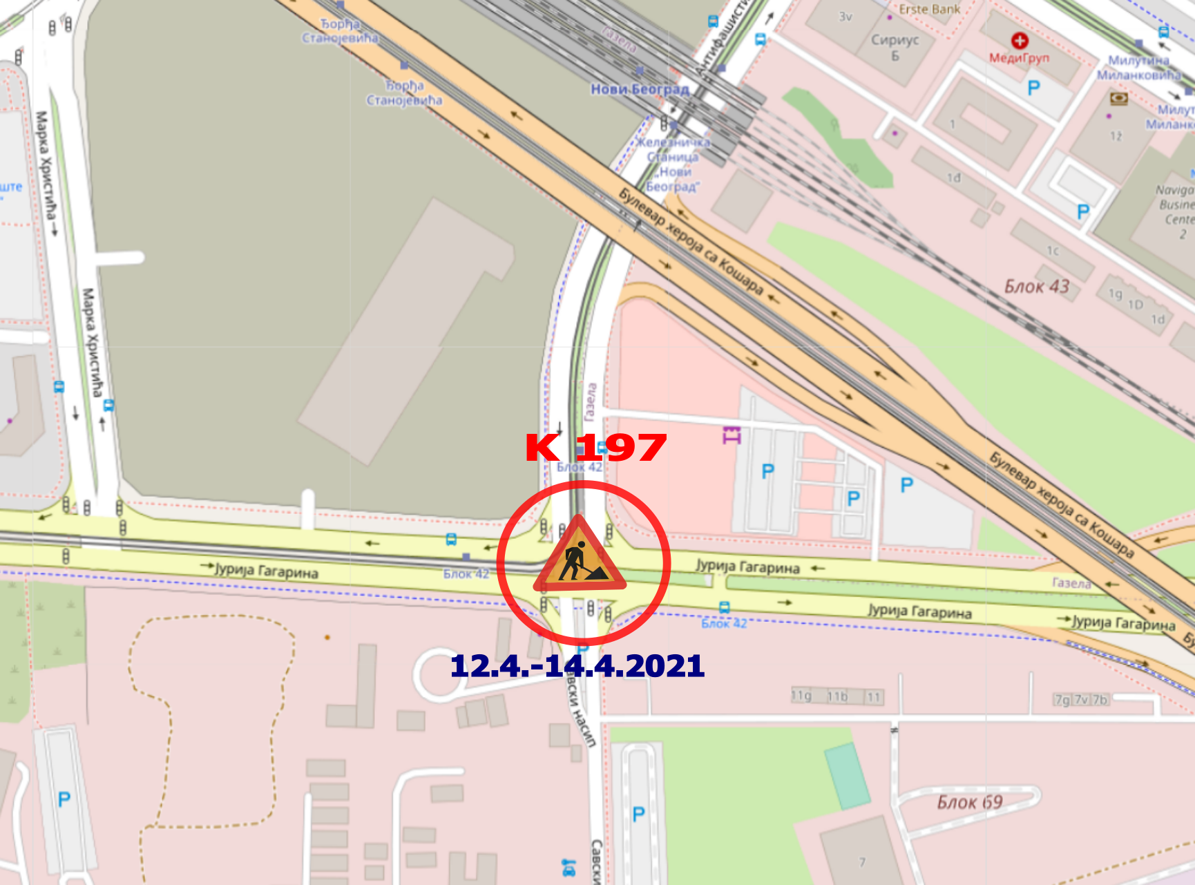 Секретаријат за саобраћај обавештава грађане да ће у периоду од 12.4 до 14.4.2021. године доћи ће до наставка радова на изградњи Система за адаптибилно управљање светлосном саобраћајном сигнализацијом. Радови ће се изводити на раскрсници Јурија Гагарина и Антифашистичке борбе (К197)