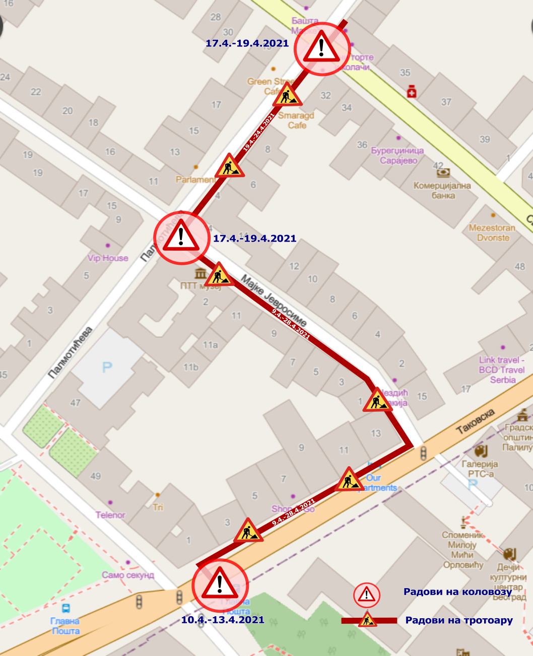 Током радова на у појачавању 35kV мреже које обавља Електро привреда Србије доћиће до измене режима саобраћаја и заузећа тротоара у улицама Таковска, Мајке Јевросиме, Палмотићева и Светогорска у периоду од 9. 4. до 19.4.2021. године, по фазама.