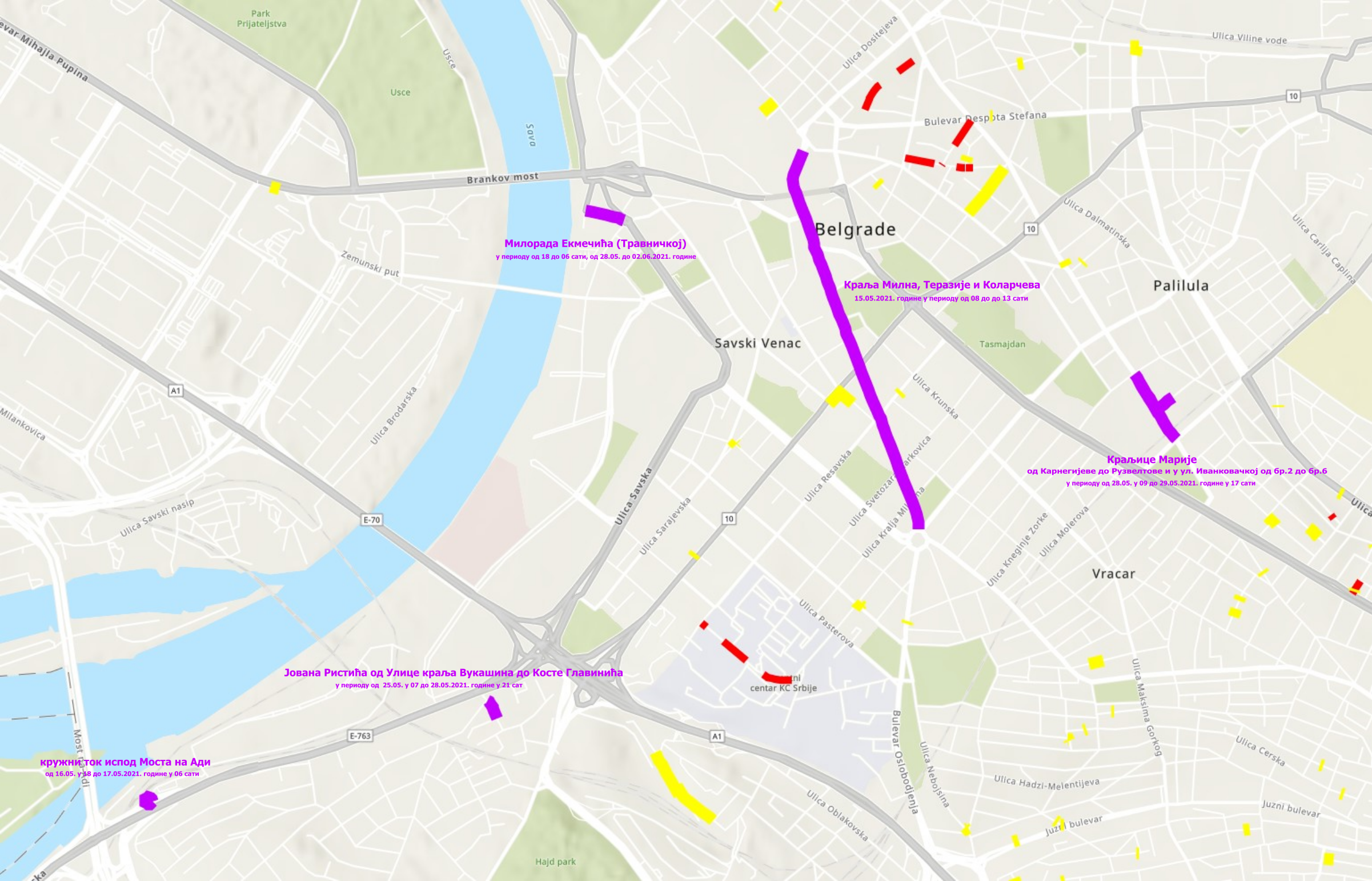 - у Улици краљице Марије од Карнегијеве до Рузвелтове и у ул. Иванковачкој од бр.2 до бр.6 - у периоду од 28.05. у 09 до 29.05.2021. године у 17 сати;